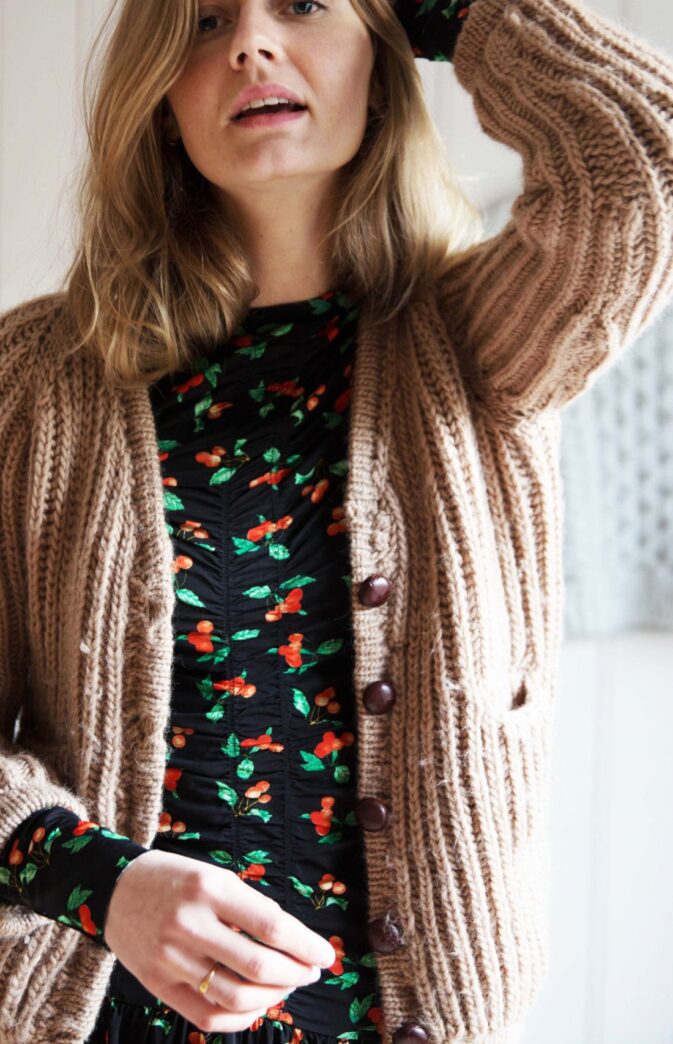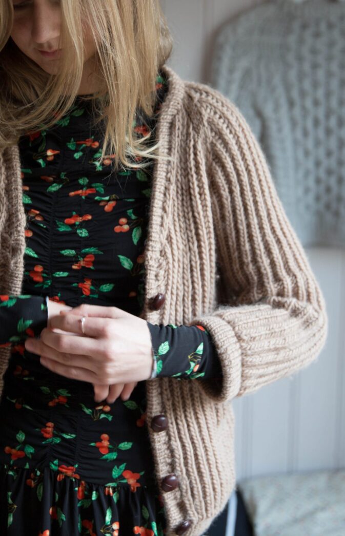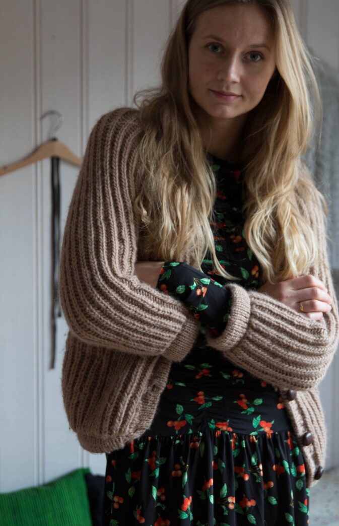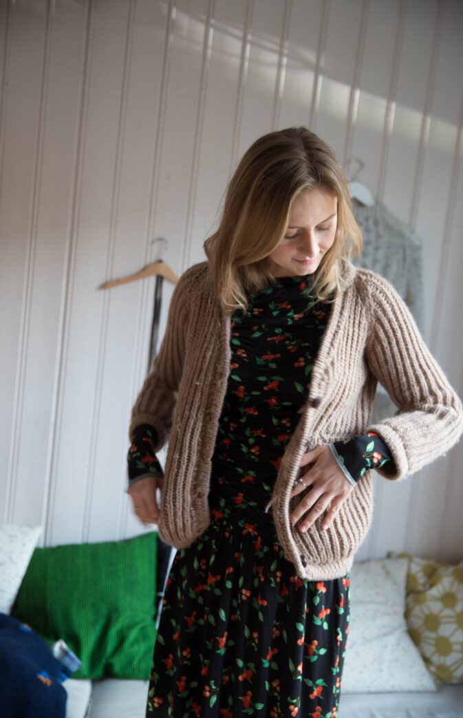 Patent knit makes the jacket soft and airy. Model wearing color Cookie dough brown.