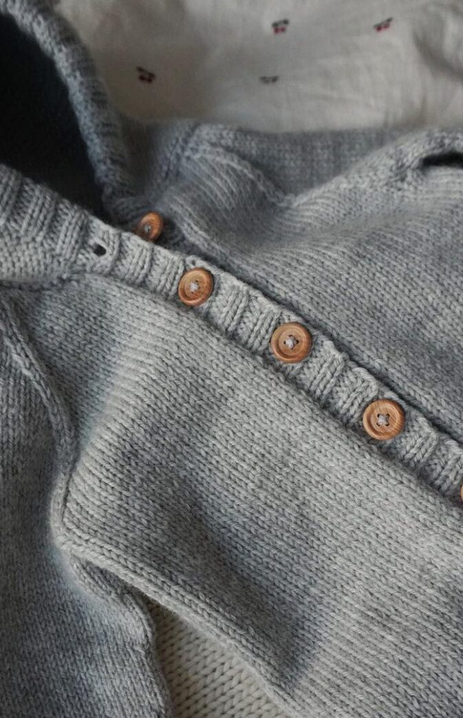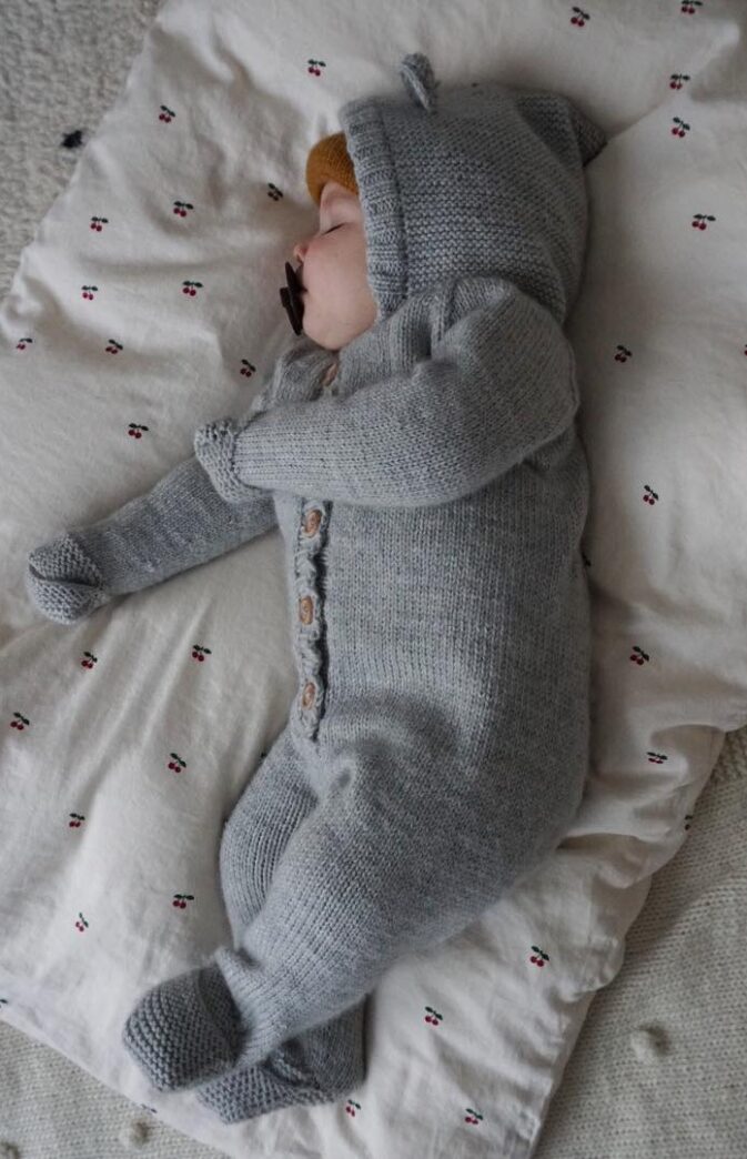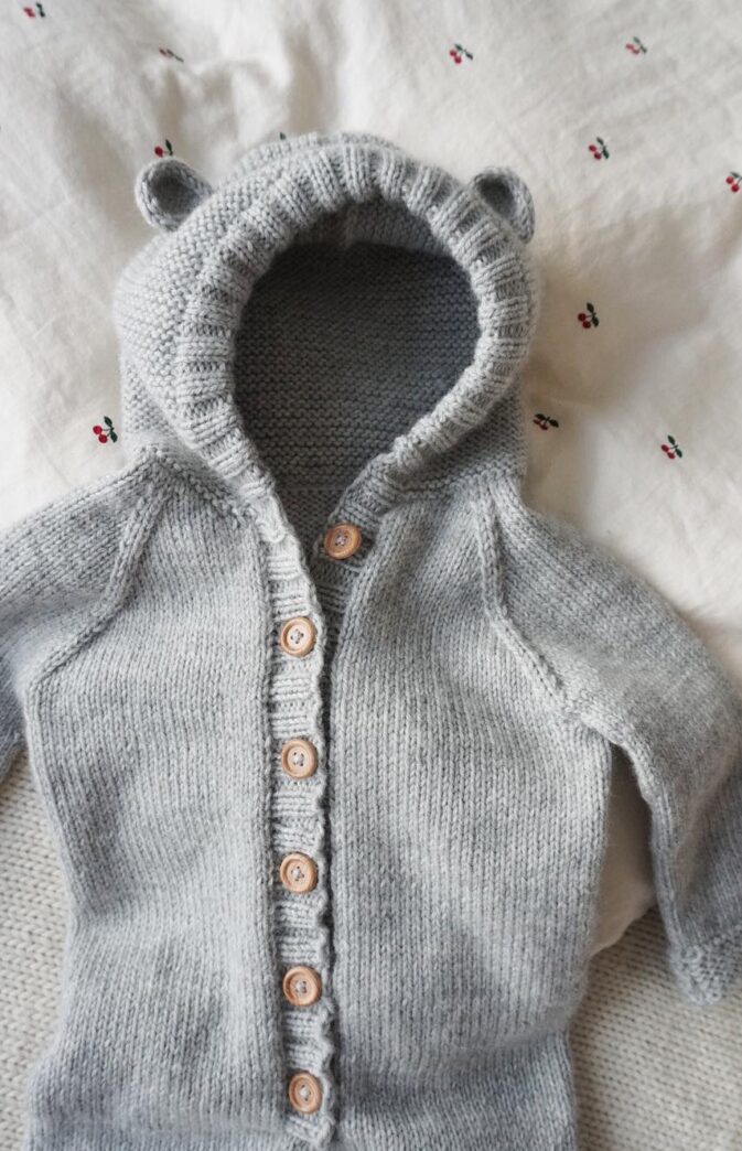 Knitting kit with yarn and free digital knitting pattern. Knitting pattern for a cute baby jumpsuit with ears. The jumpsuit is knitted from the bottom up with raglan decreases on the yoke. It has practical folded edges on the arms and legs (mittens and socks on the jumpsuit) and a lovely hood with teddy bear ears. Perfect for both strollers, car suits and sleepsuits for babies and children.