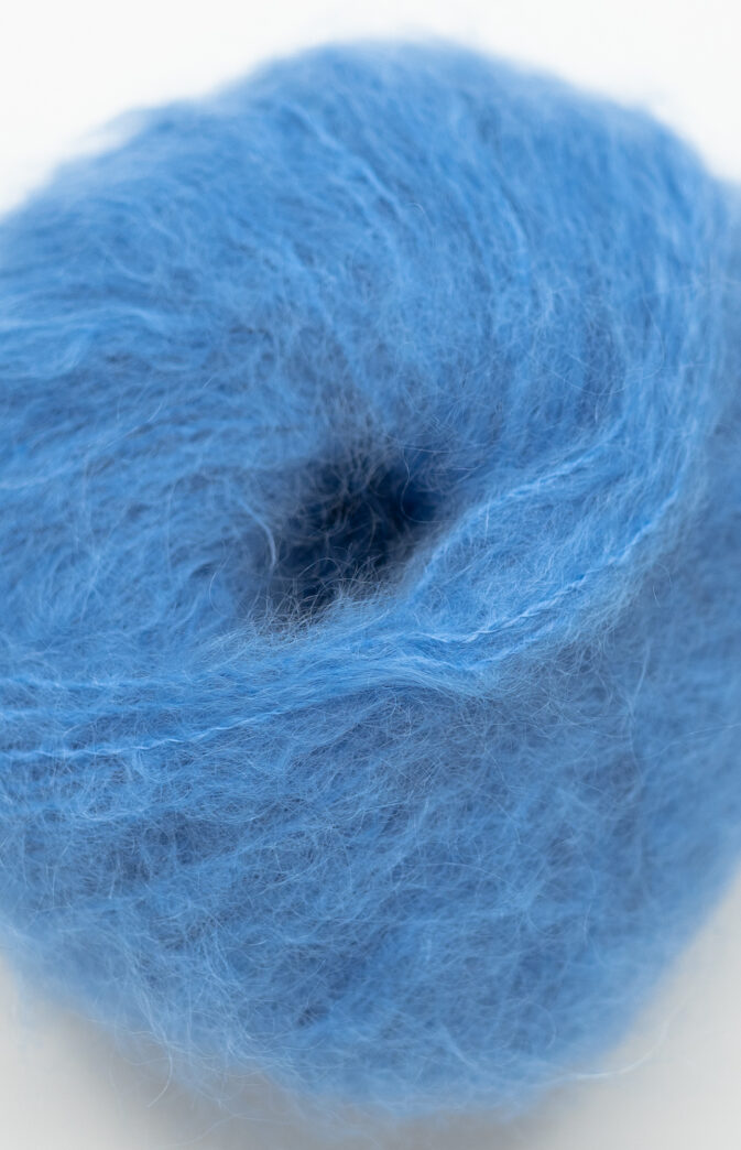 The perfect match of mohair and merino wool. Chunky, lovely yarn that sheds little. Ideal yarn for thick needles. Soft to wear – and great to knit with! Pure mid-blue mohair yarn.