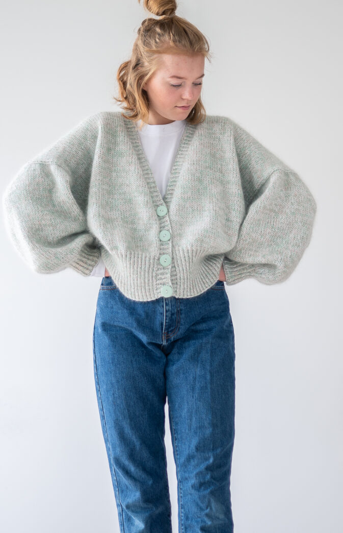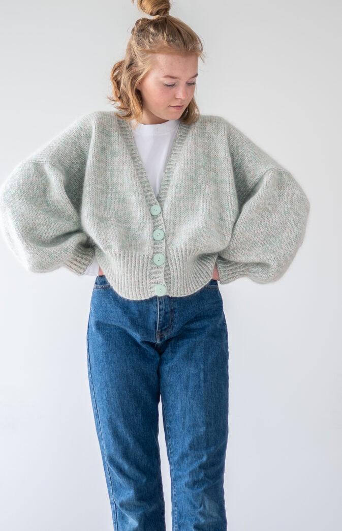 Knitting kit with yarn and free digital knitting pattern. Simple and nice cardigan knitted in one thread Pop merino and 2 threads Hip Mohair. Nice detail with long rib in body and sleeves. Wide fit, normal length body. Knit from the bottom up, back and forth.