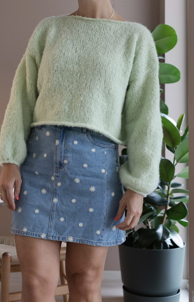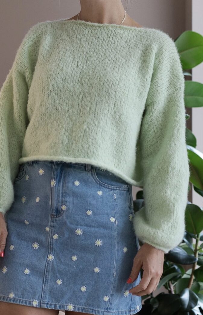 Pictured in the color "(I wanna) Dance with somebody" BonBon. Green sweater knitted in the color "My heart is set on you" BonBon