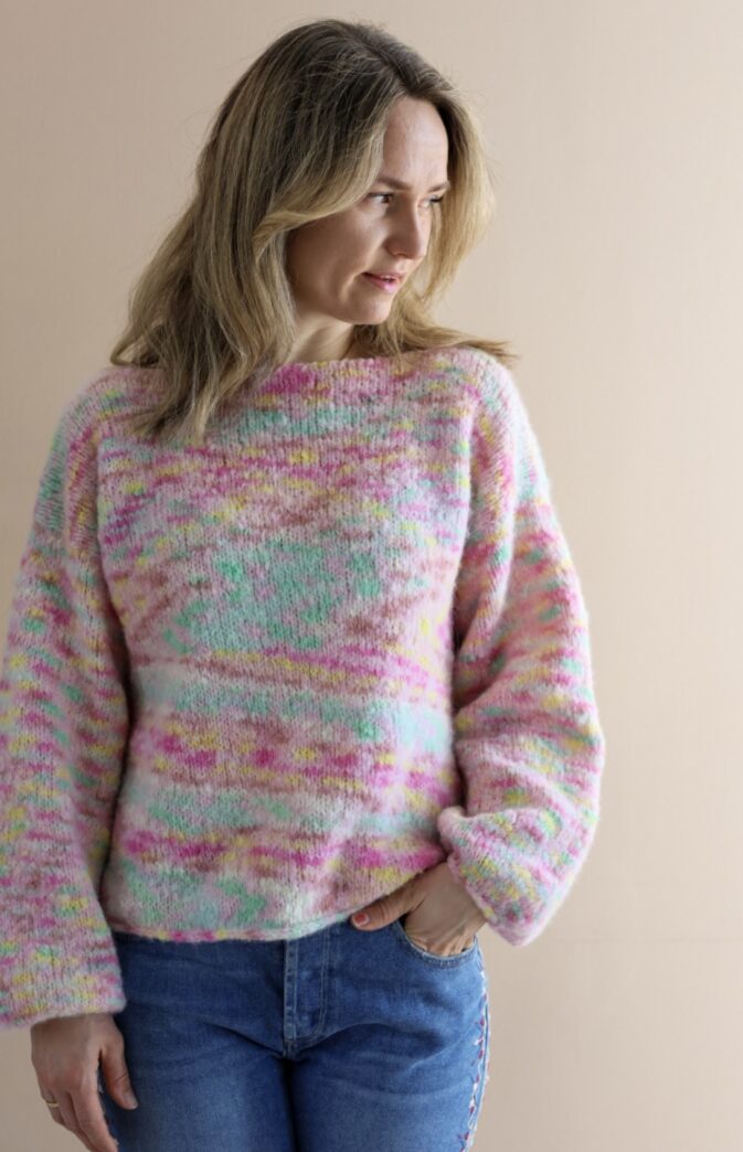 The sweater is knitted in Bon Bon – a lovely blend of alpaca and merino. The piece is knitted top down, the sleeves and body are finished with an i-cord edge. The sweater in the picture is knitted in the color (I wanna) Dance with somebody in size M (model is 170 cm tall and size M).