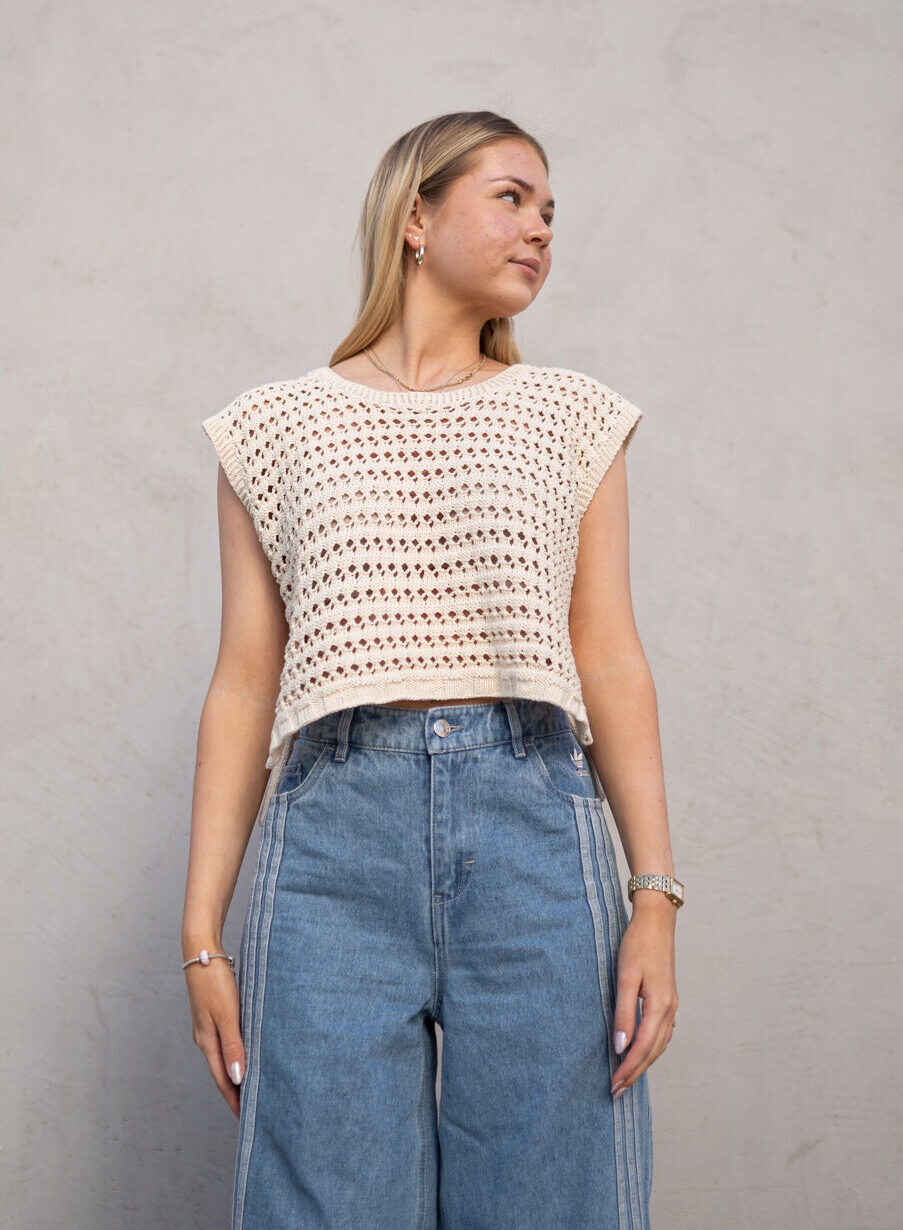 Mindy is knitted from the top down. The front and back are knitted separately and then sewn together at the sides. The back is longer at the split than the front. The fit is somewhat loose, short model at the top.