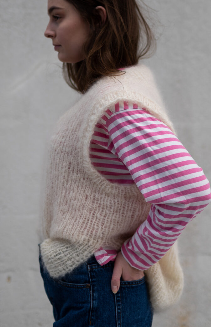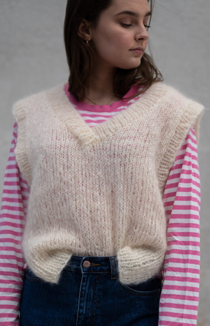 Fluffy slipover with V-neck knitting pattern. Knit from the bottom up. Splits at the sides, longer at the back. Roomy fit.