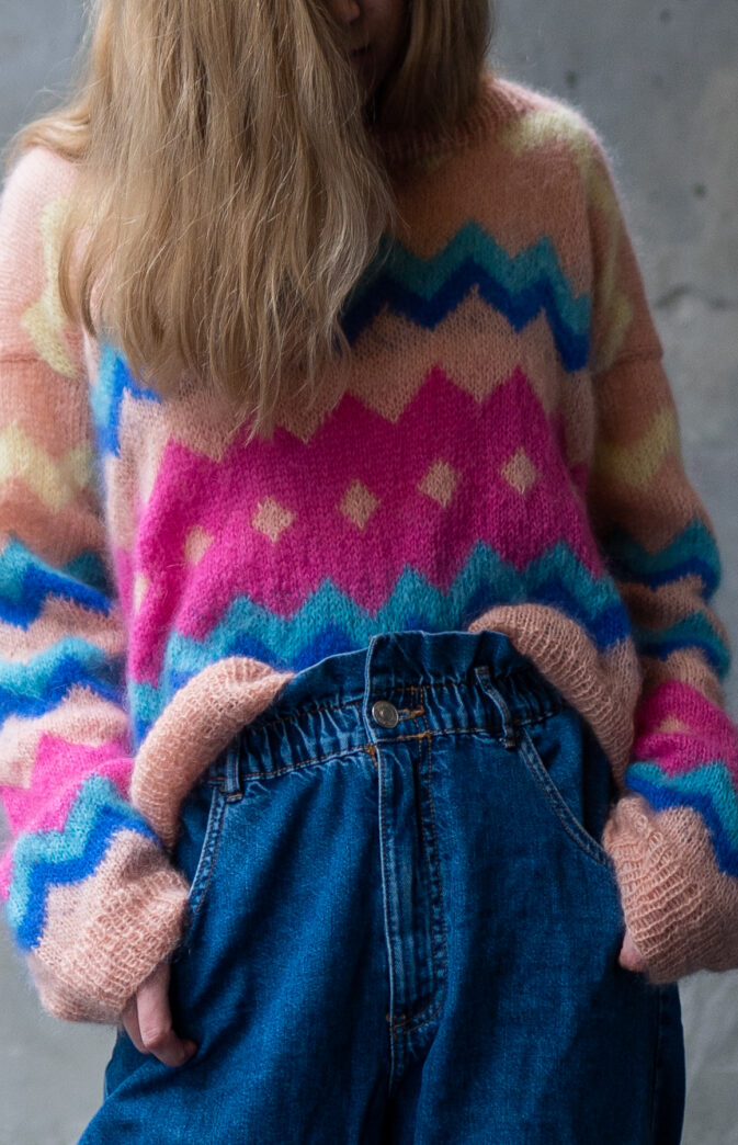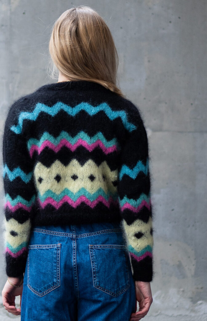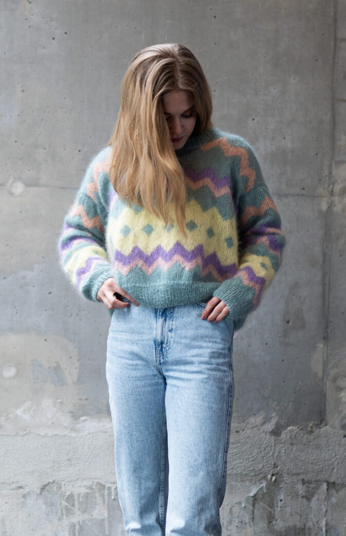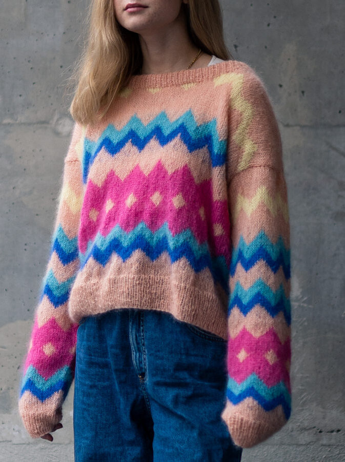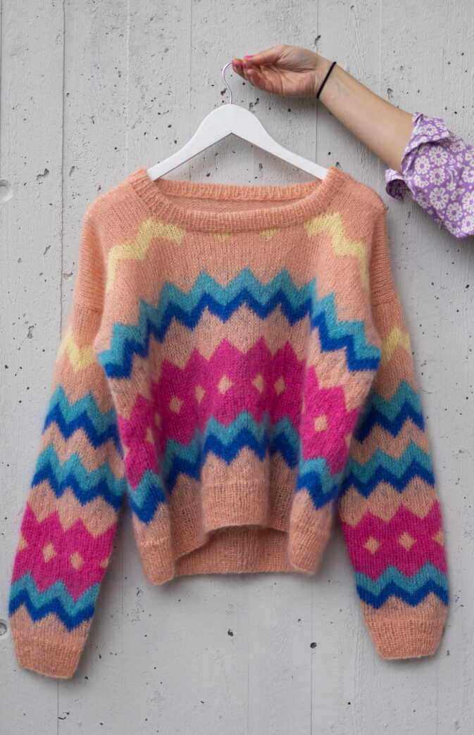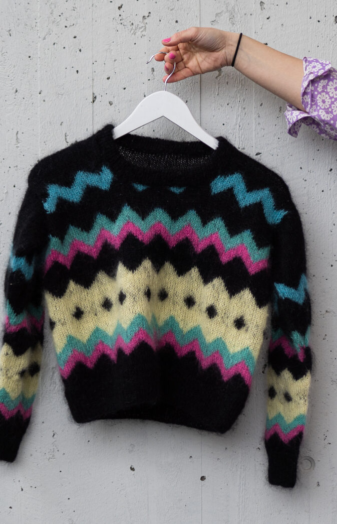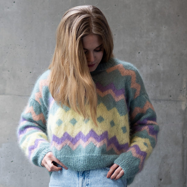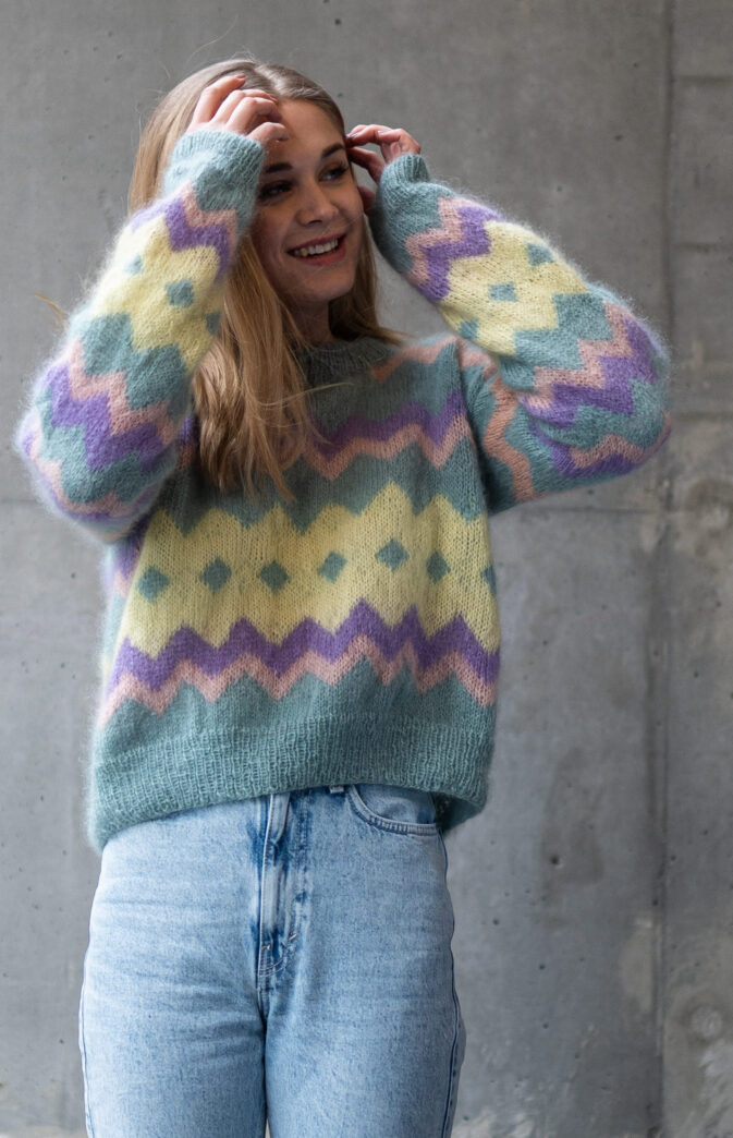 Colorful and fluffy knit in 80s style. We love mohair, colors and the 80s! Fun and colorful knitting pattern inspired by 80s fashion. Have fun with colors and patterns!