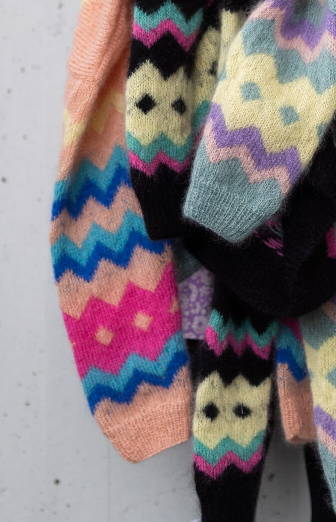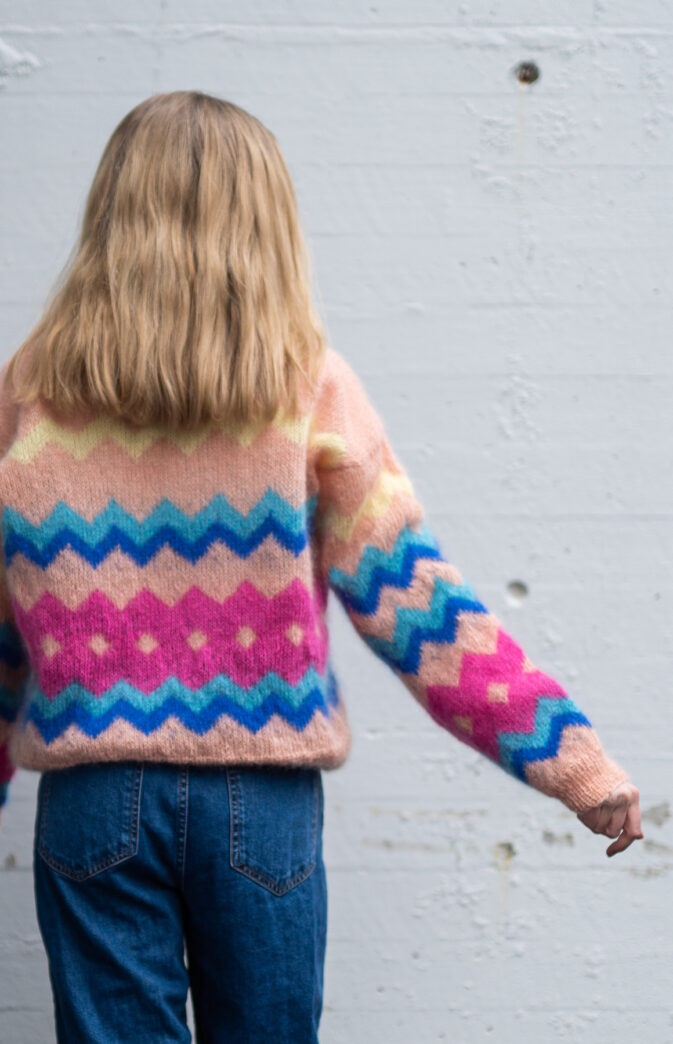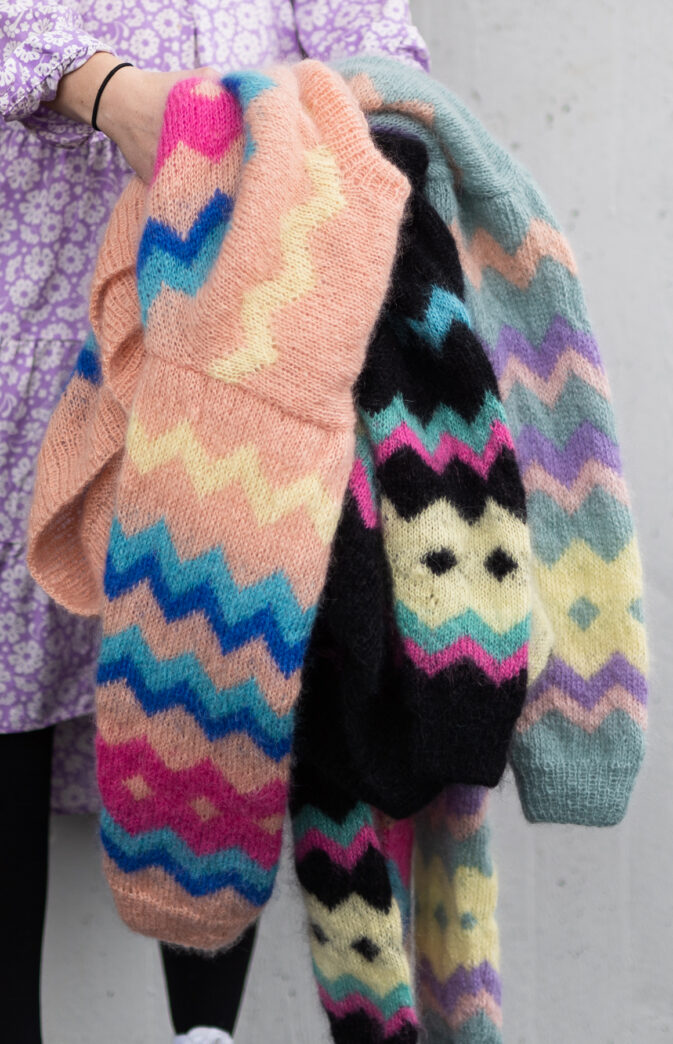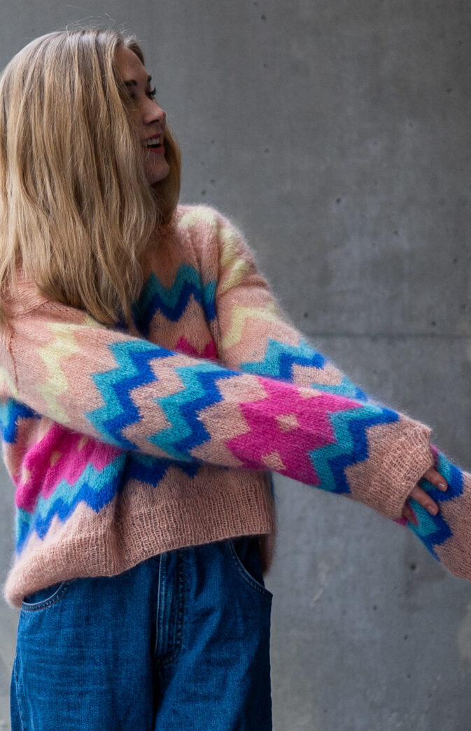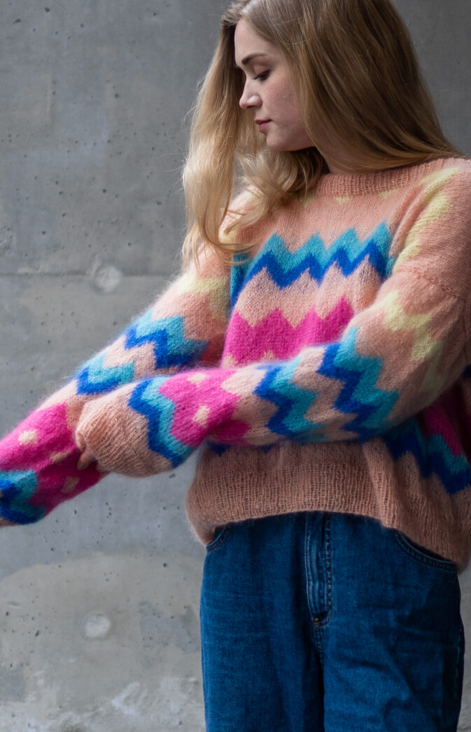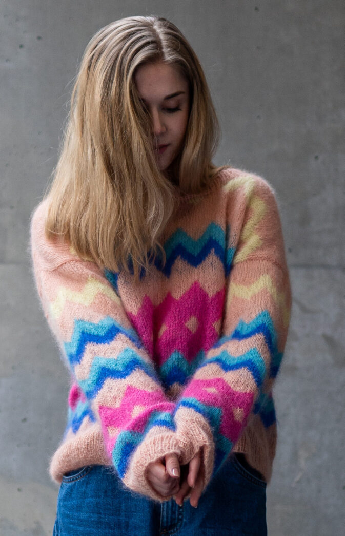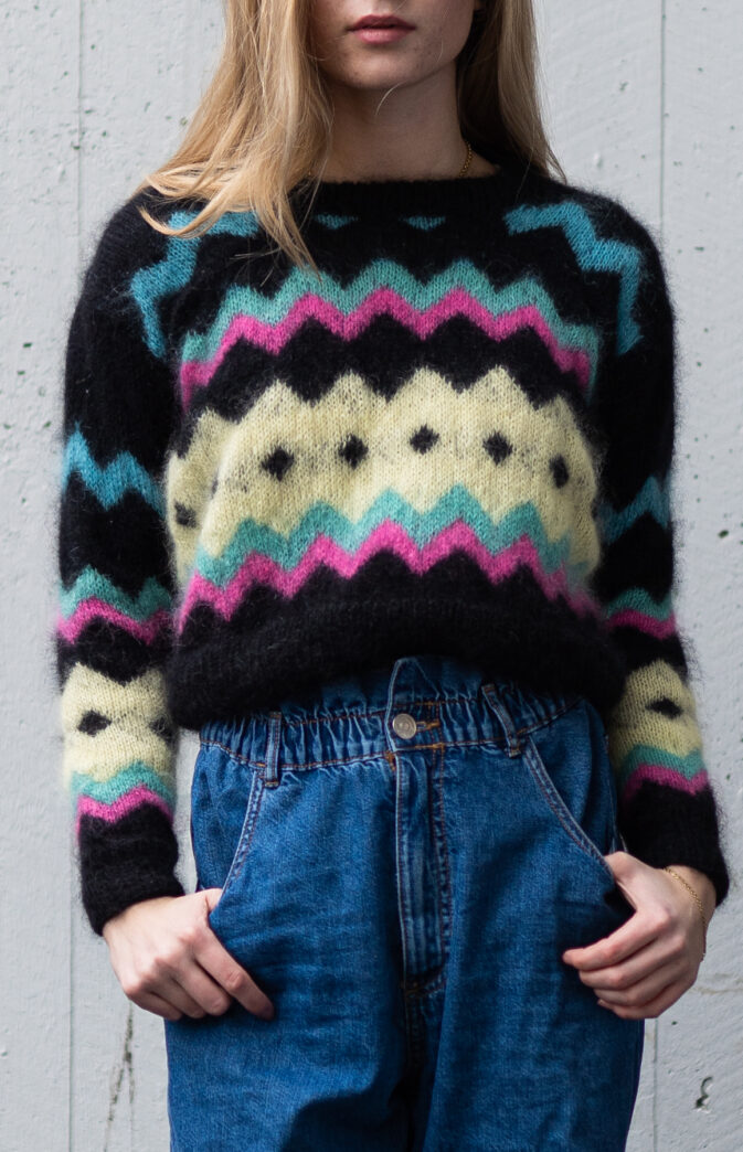Colorful and fluffy knit in 80s style. We love mohair, colors and the 80s! Fun and colorful knitting pattern inspired by 80s fashion. Have fun with colors and patterns!