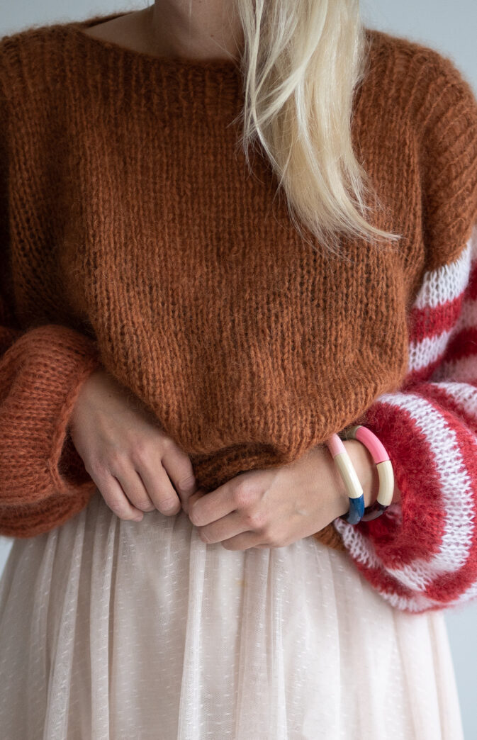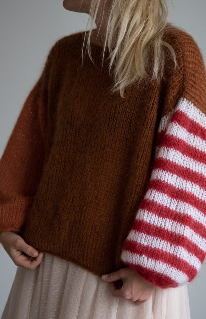 Pictured in Hip Mohair "Holiday Sky" and "Minty Breeze" knitted together (size SM). White sweater "Cotton ball" ML. Colorful (long) version in "Carmel fudge brown" (discontinued, use "Chocolate Toffee", "More Marmelade" (discontinued, use "Nougat"). Striped sleeve in "Cotton ball"l and "Berrylicious".