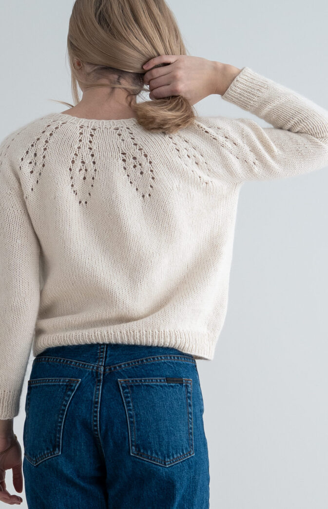 Nydelig genser med rundøkning og enkelt hullmønster. Strikkes ovenfra og ned , Rundøkning / rundfelling, strikket i med en tråd bomull og en tråd mohair .
