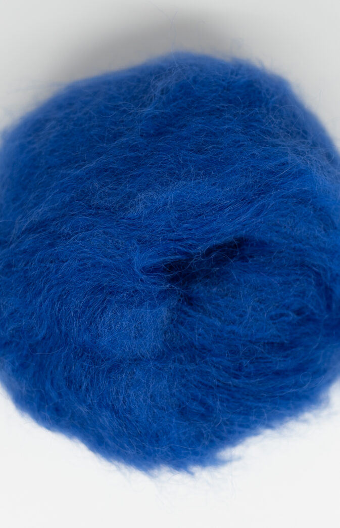 Den perfekte match av mohair og merinoull. Chunky nydelig garn som røyter lite.  Ideelt garn for tykke pinner. Myk å ha på – og digg å strikke med! Mørk knall blå mohair garn.