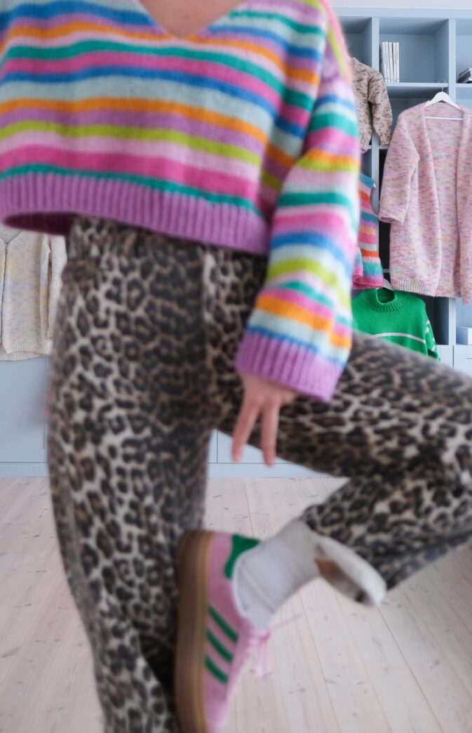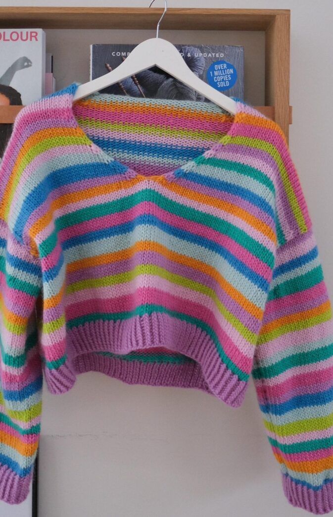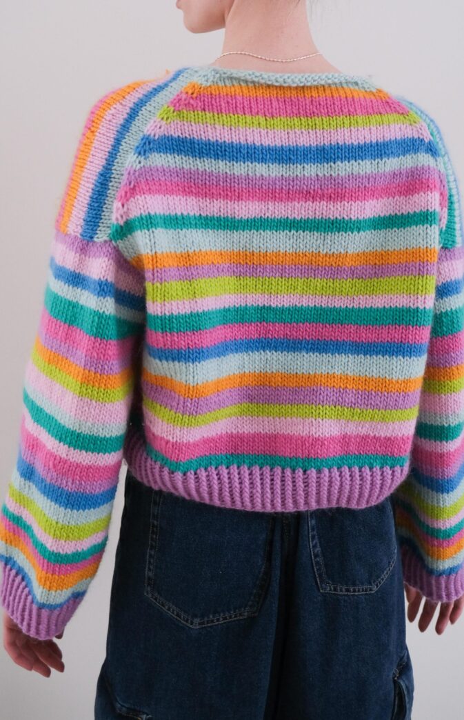 Strikkepakke med garn og gratis digital strikkeoppskrift. Strikkeoppskrift genser til dame. Fargerik stripegenser i Hip Wool. Camilla genser har en oversized og noe kort passform med V-hals og vide ermer. Du starter med å legge opp masker i nakken som strikkes frem og tilbake mens det økes i hver side. Når bakstykket er ferdig strikkes forstykkene, ved at du strikker opp masker fra bakstykket, i hver side. Forstykkene og bakstykket strikkes sammen etter at ermeåpning og halsutringning er ferdig. Ermene strikkes ovenfra og ned ved at du strikker opp masker i ermeåpning.
