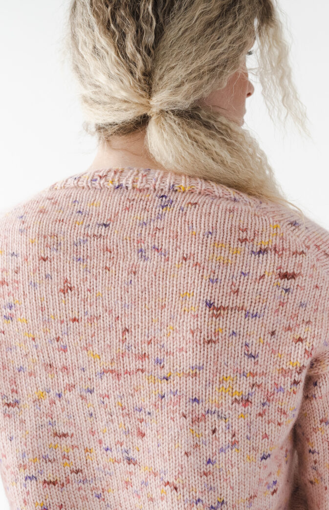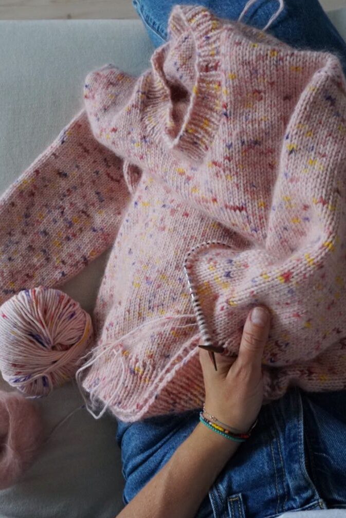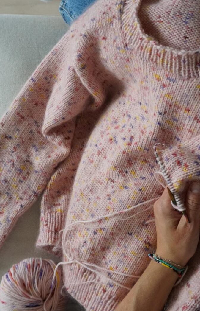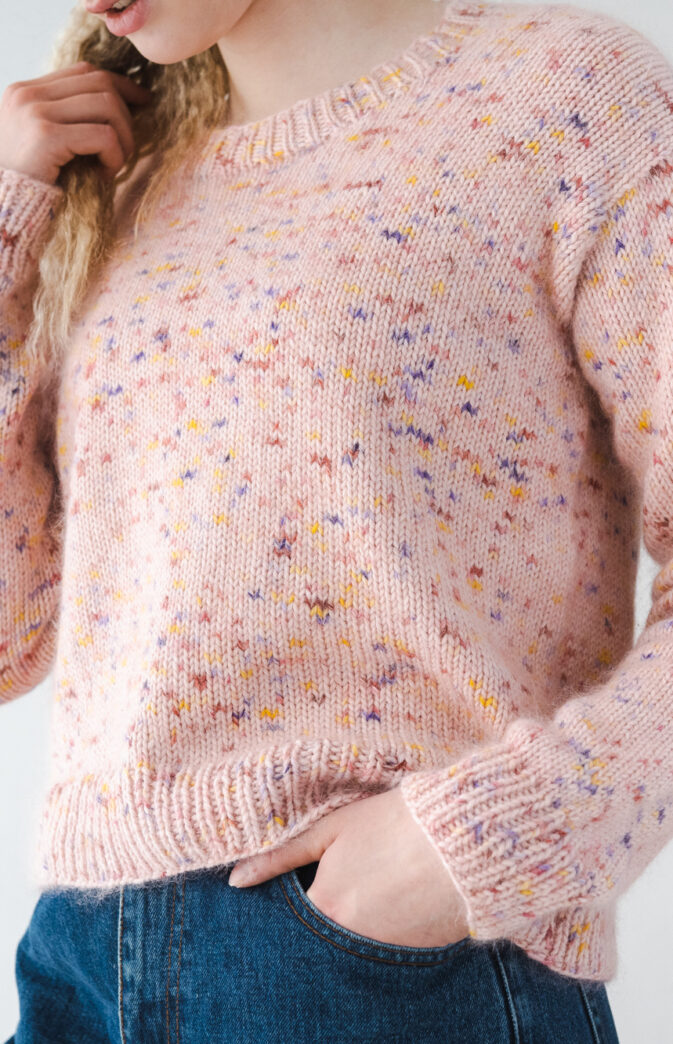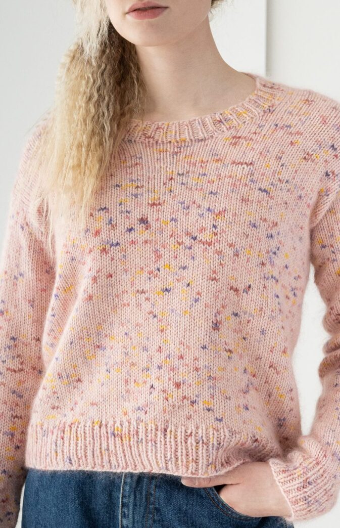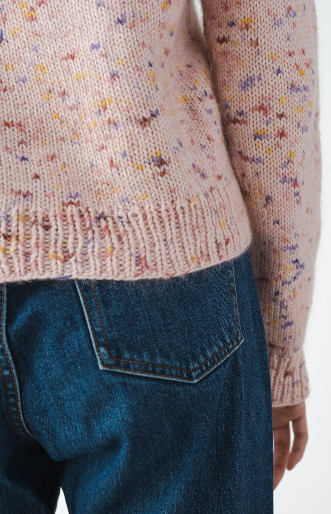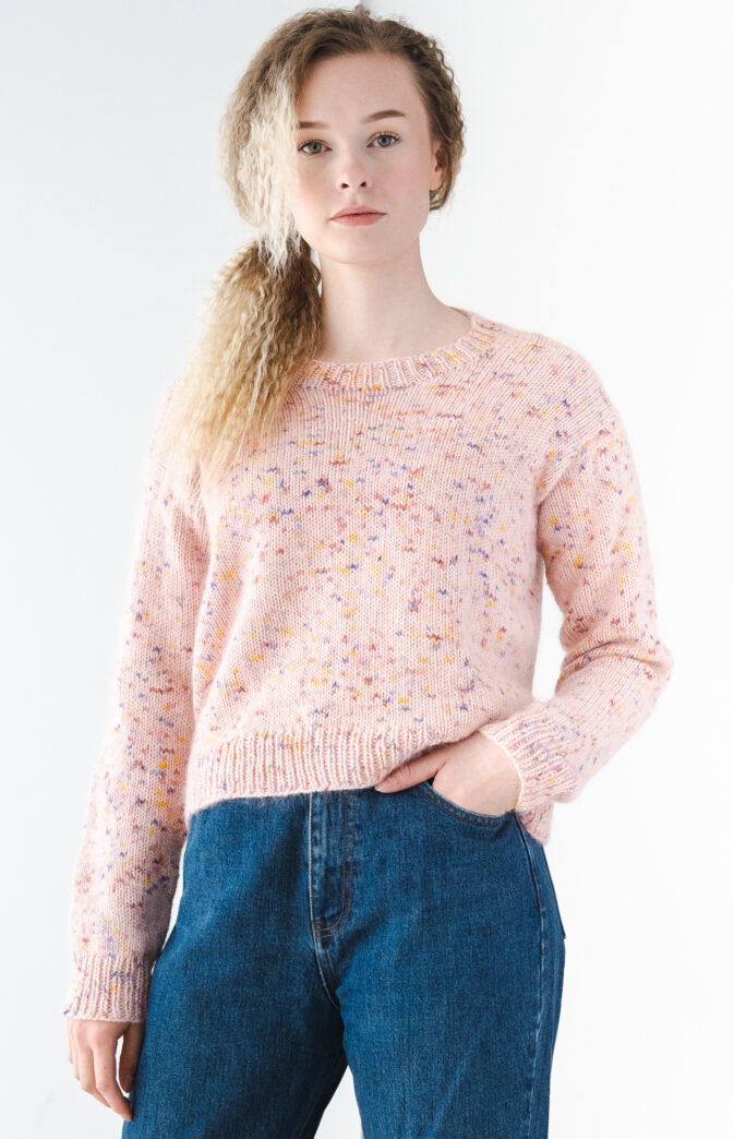 Strikkepakke med garn og gratis digital strikkeoppskrift. Nydelig hverdagsgenser som passer like godt til ett par jeans som over en kjole. Genseren strikkes ovenfra og ned i en tråd Pop Merino holdt sammen med en tråd Hip Mohair. Den har normal passform og lengde.