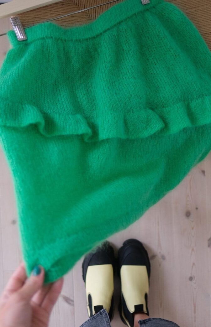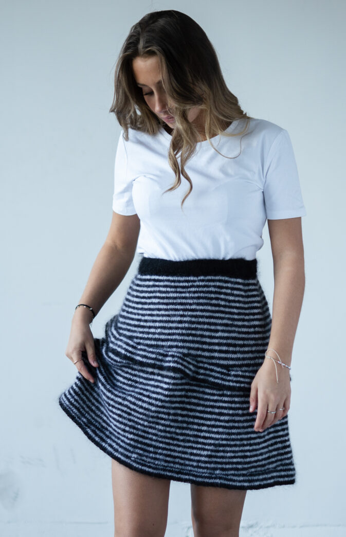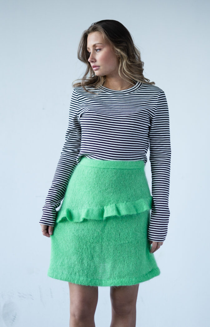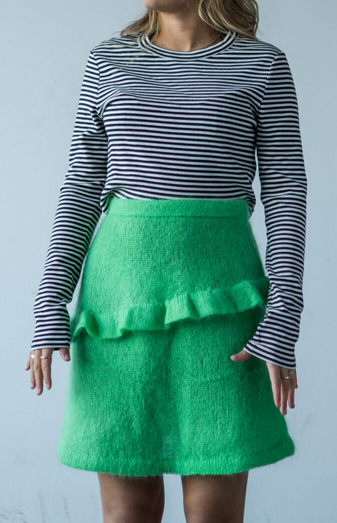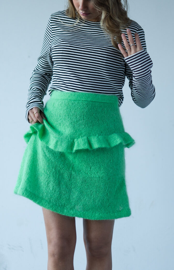 Avbildet i Hip Mohair «Jelly bean green» (str S) , stripete skjørt i «Black is back» og «Cotton ball» (str M)