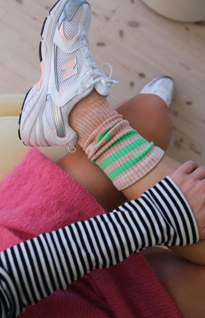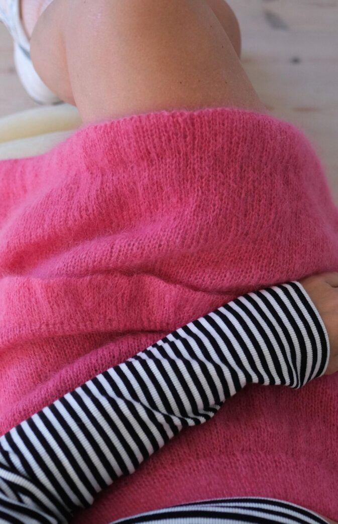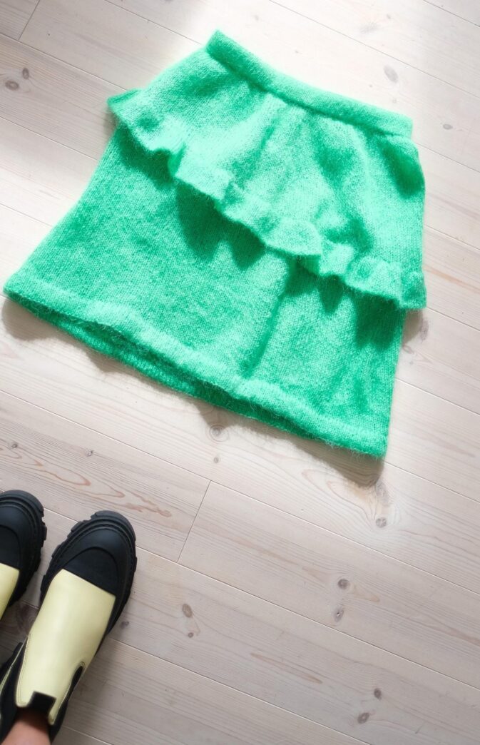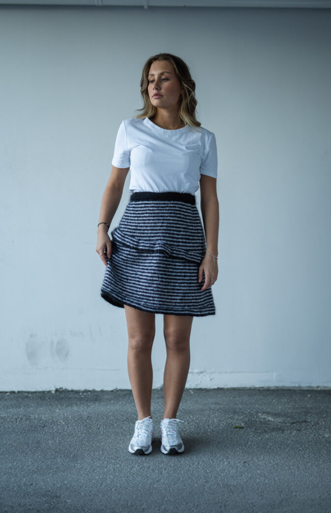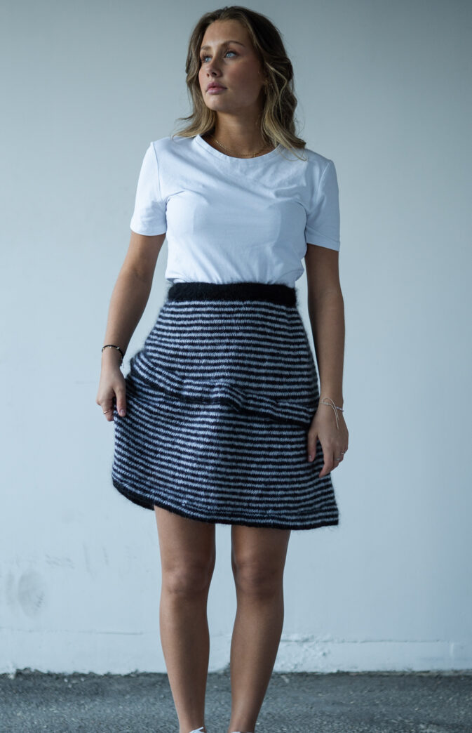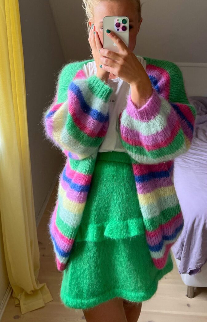 Avbildet i Hip Mohair «Jelly bean green» (str S) , stripete skjørt i «Black is back» og «Cotton ball» (str M)
