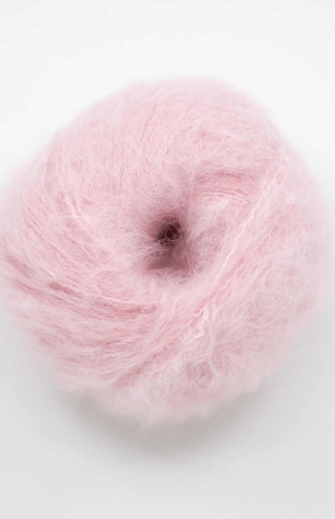 Den perfekte match av mohair og merinoull. Chunky nydelig garn som røyter lite. Ideelt garn for tykke pinner. Myk å ha på – og digg å strikke med! Lys rosa mohair garn.