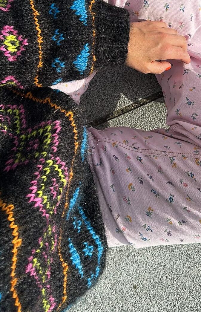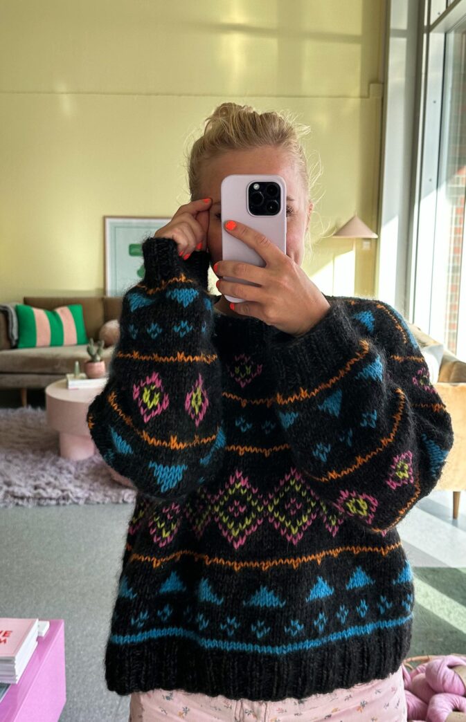 Strikkepakke med garn og gratis digital strikkeoppskrift. Fargerik 80talls inspirert strikkegenser. Fluffy strikk med et lekent mønster. Her mikses ulike garnkvaliteter og farger til en unik og kul genser. Strikkes nedenfra og opp, ermer strikkes ovenfra og ned.