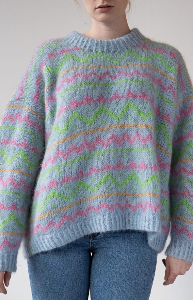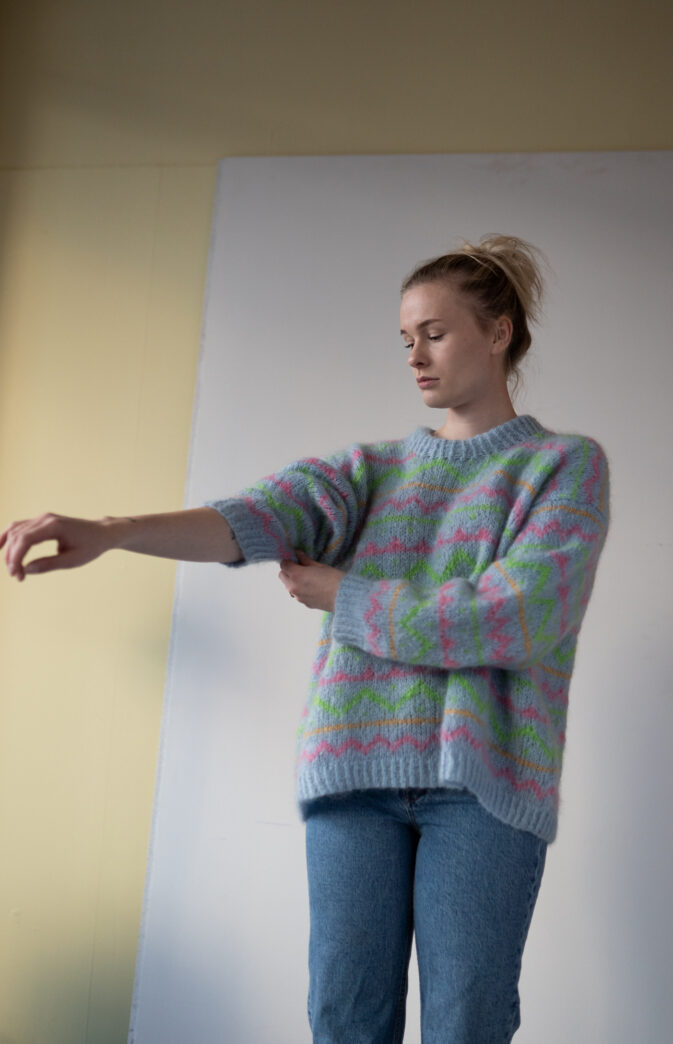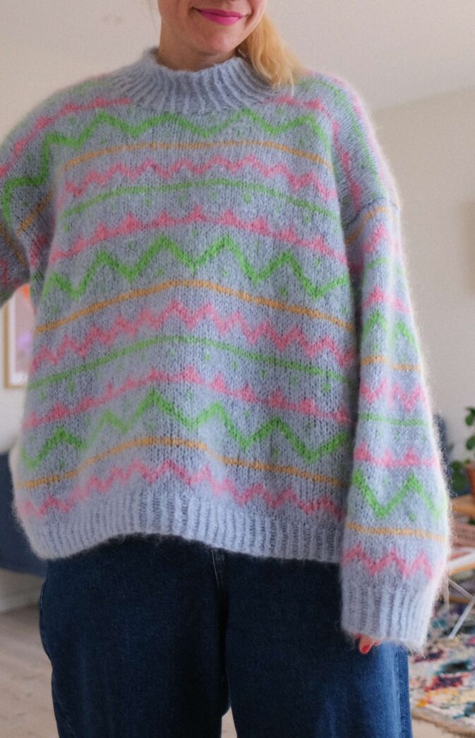 Strikkepakke med garn og gratis digital strikkeoppskrift. Fargerik strikkegenser i 80talls stil. Tivoli genseren – genser med enkel mønsterrapport som er gøy å strikke! Genseren strikkes nedenfra og opp. Når ermeåpning skal strikkes deles genser inn i forstykke og bakstykke som strikkes videre hver for seg. Ermer strikkes for seg og monteres på bol eller velg å strikke dem ovenfra og ned – monteringsfri.