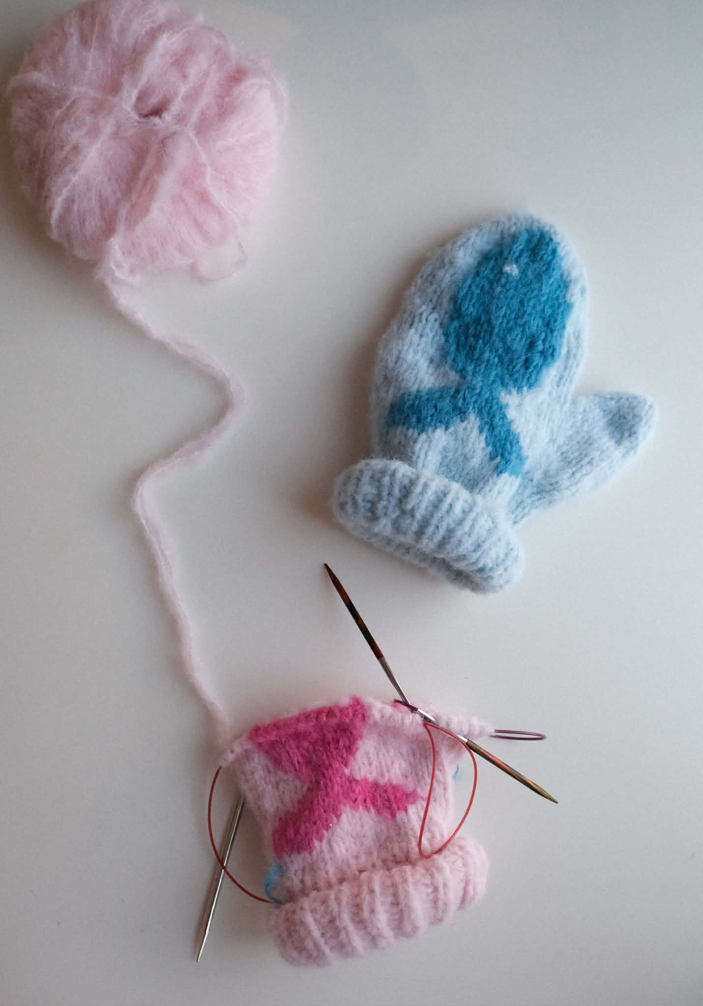 Søte varme votter som strikkes i dobbel tråd «BonBon» , en blanding av børstet alpakka og ull. Fisk strikkes i Fluff Mohair (kan også strikkes i BonBon).