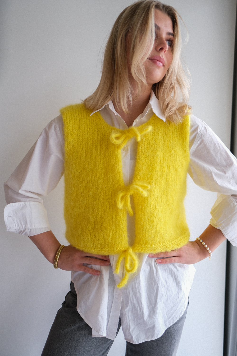 Strikkeoppskrift på enkel vest til i Fluff Mohair. Strikkes ovenfra og ned. Du starter med bakstykket. Når ermåpning er ferdig strikkes forstykker hver for seg. Forstykker og bakstykket strikkes så sammen og strikkes videre ned vest er ferdig. Du avslutter med å strikke 6 i-cord snorer, 3 i hver side. Avbildet er vest i «Flash» Fluff Mohair i størrelse M. Bruk gjerne rester og kombiner ulike mohair typer. Eks kan 4 tråder tynn mohair som Hip Mohair strikkes sammen for samme tykkelse/ strikkefasthet som Fluff Mohair.
