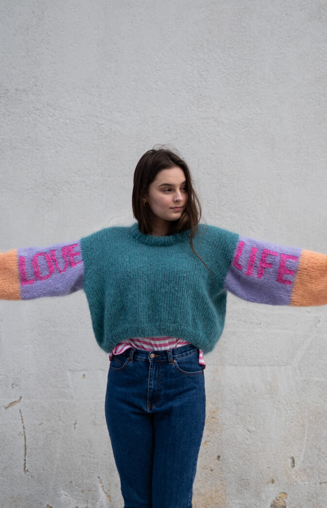 Strikkepakke med garn og gratis digital strikkeoppskrift. Fluffy slipover med V-hals strikkeoppskrift. Strikkes nedenfra og opp. Splitt i sidene, lenger i ryggen. Romslig passform.