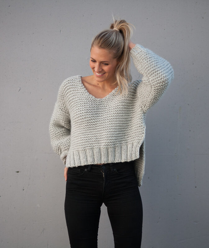 Oppskriften inneholder 2 forskjellige størrelser og gensere – en med splitt og lengre bak, en genser med samme lengde for- og bakdel. Modellen er 168 cm høy, iført størrelse S / M i Foggy lys grå. Modell i Pale blue (169 cm høy) i størrelse L / XL.