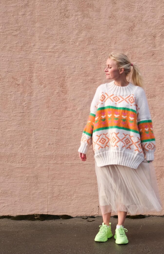 Også avbildet med hovedfarge Hip Wool "Dancing Snowflake" og "Cotton ball" Hip Mohair. Mønsterfarge 1: "On fire Orange" og "Oh la la orange" Hip Mohair. 2: "Jelly bean green", 3: "Hubba Bubba" og "Bubblegum" Hip mohair, str XL-XXL.