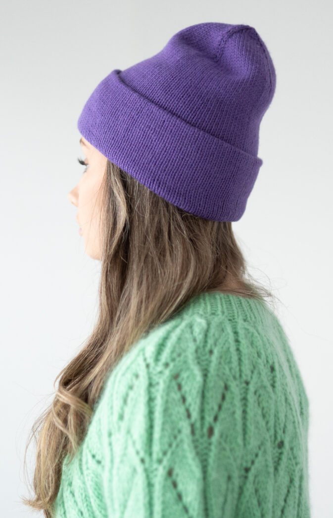 Modell avbildet har på seg str S i fargen «Playful Purple» Pop merino.
