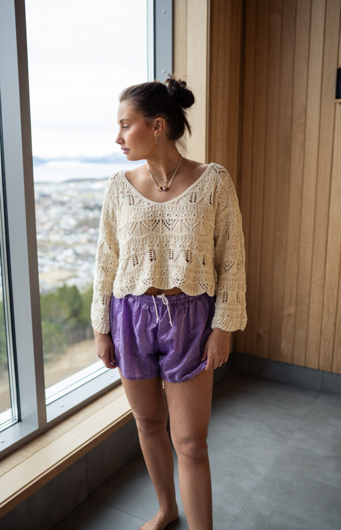 Elegant og lekker genser i bomull.  Strikkes nedenfra og opp med et nydelig strukturmønster. Først strikkes bolen rundt. Deretter felles det til ermehull og bakstykket strikkes frem og tilbake. Så strikkes forstykket frem og tilbake et stykke før det deles til to forstykker som strikkes ferdig hver før seg med fellinger og økninger for å danne utringningen. For- og bakstykker syes sammen over skulderen. Ermene strikkes rundt nedenfra og opp og monteres så i ermeåpningene.