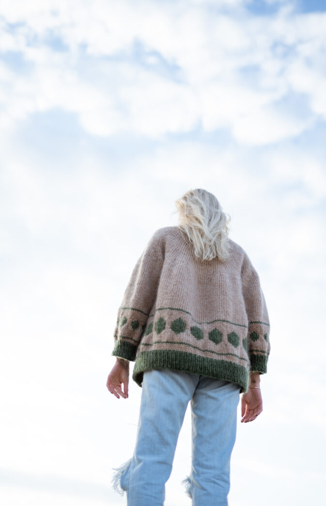 Strikkepakke med garn og gratis digital strikkeoppskrift. Den perfekte strikkegenser! Stor og god, strikket ovenfra og ned med rundt bærestykke. Enkelt dekorativt mønster nede på bol og ermer. Strikket i en kombinasjon av Hip Wool og Hip Mohair.