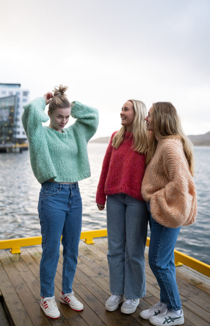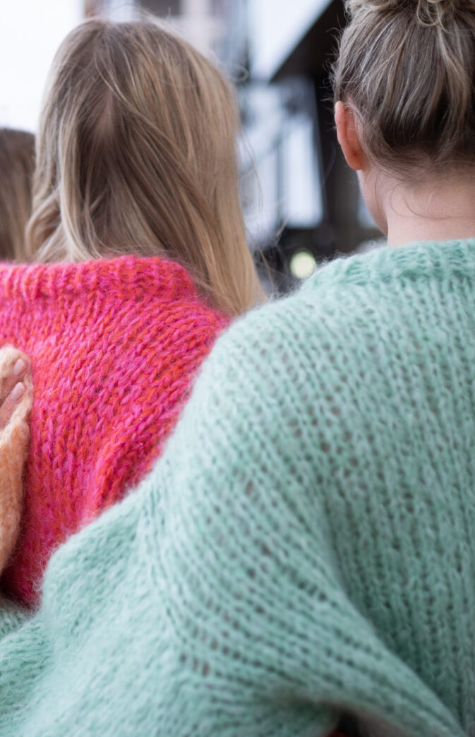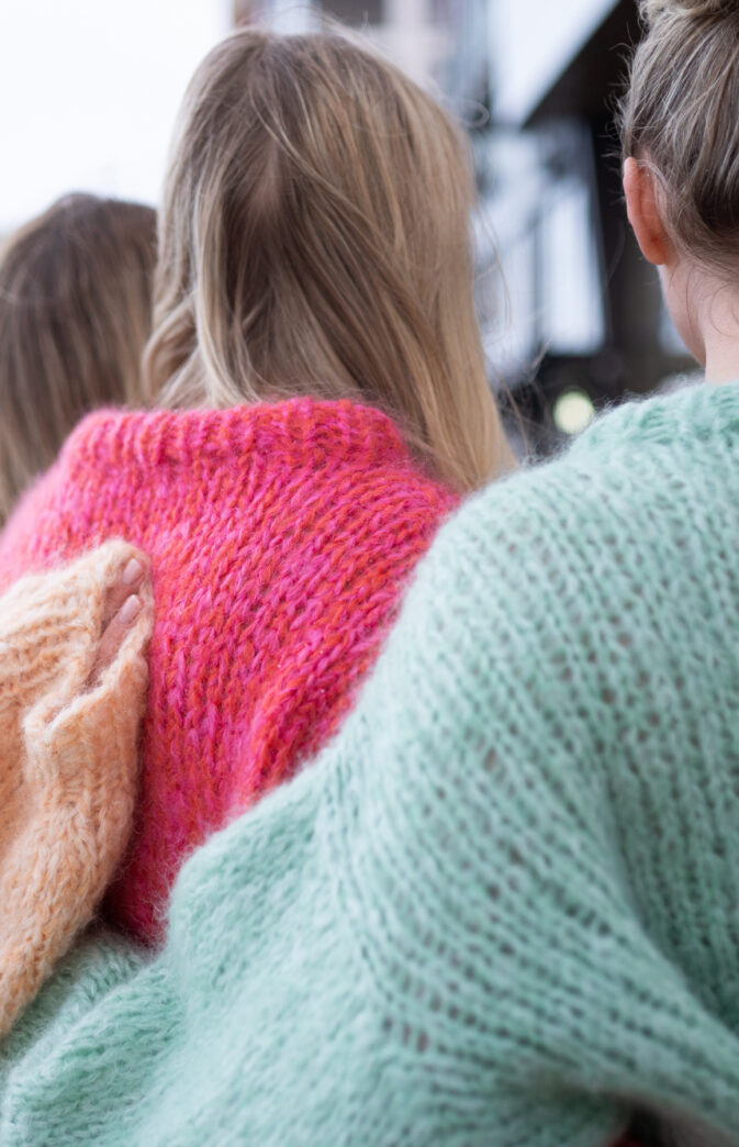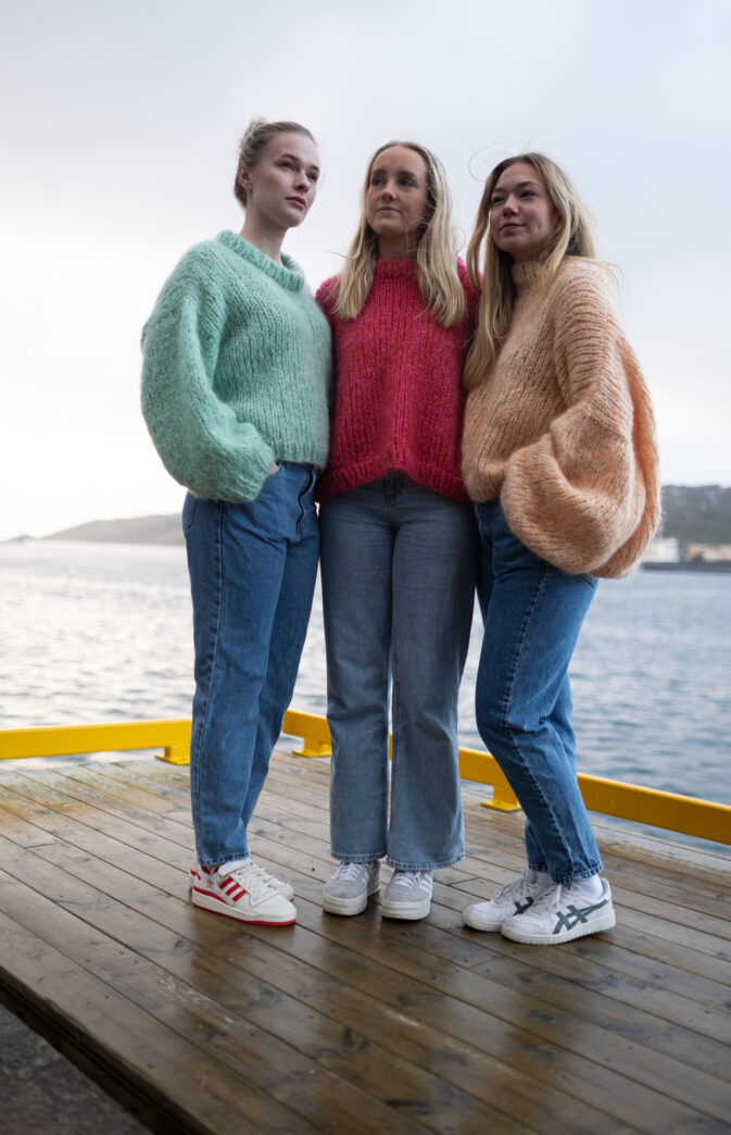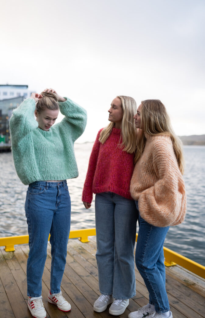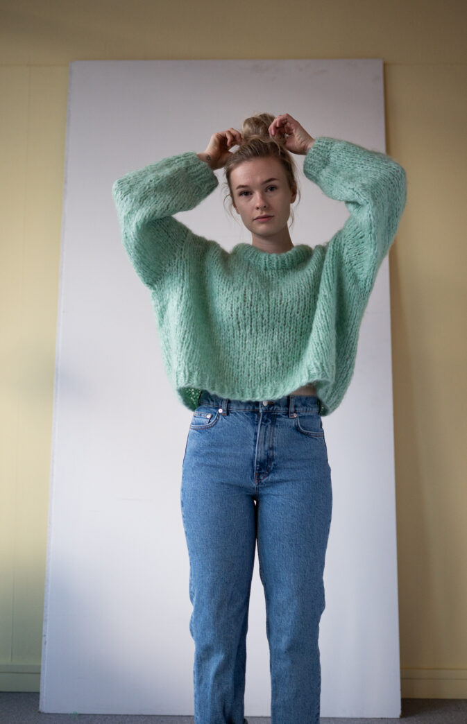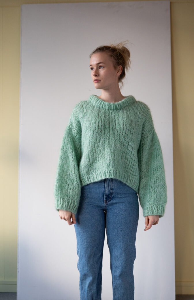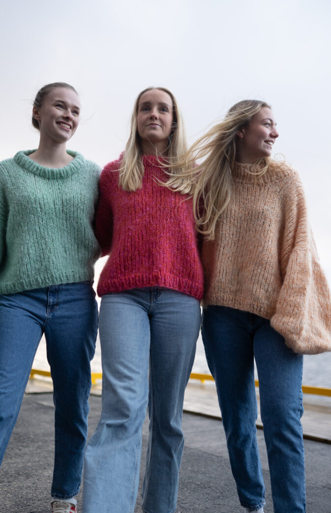 Strikkepakke med garn og gratis digital strikkeoppskrift. Chunky genser med oversized passform. Strikket i dobbel tråd Fluff mohair. Striper er alltid på moten! Lag det i favorittfargene dine. Kul fluffy genser med oversized passform. Strikket i dobbel tråd Fluff mohair som gjør genseren chunky og god. Mohairgenser med striper på tykke pinner – perfekt for nybegynnere.