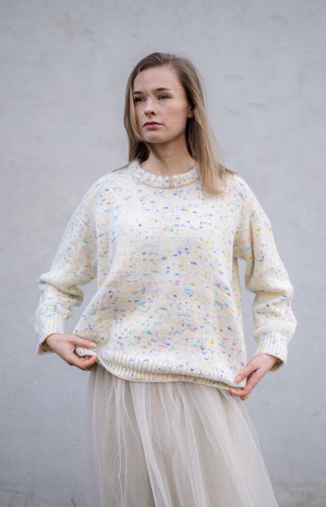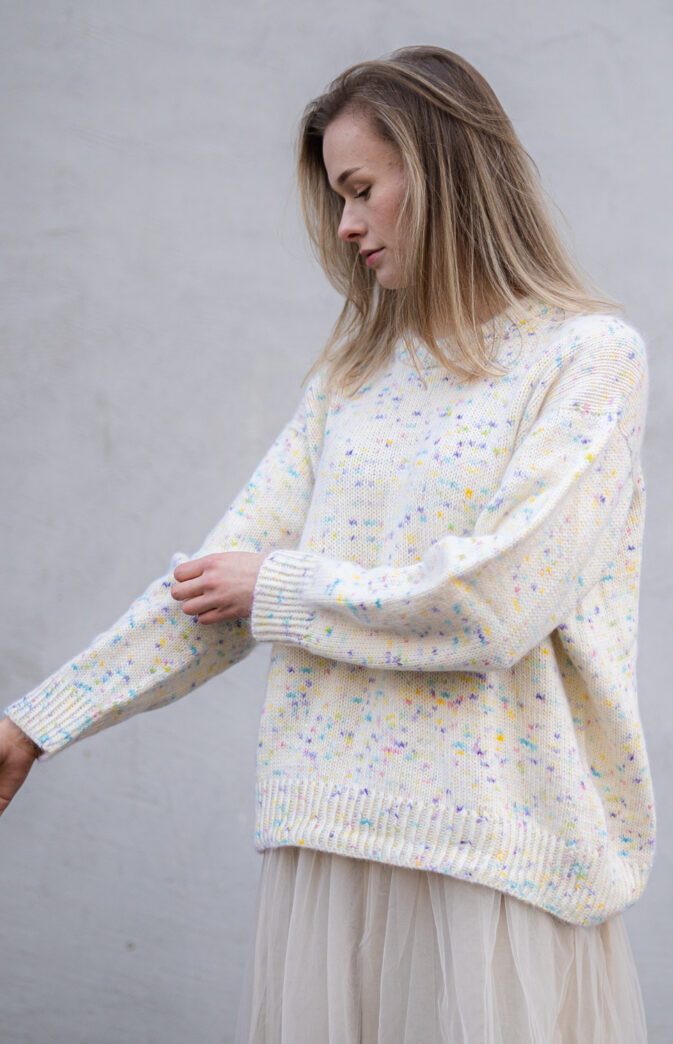 Genser kan også strikkes i kun Pop merino. Gå ned 0,5 mm i pinnestr, og strikk prøvelapp for å sjekke målene.Strikk den ensfarget, med striper, ulike farger, todelt med en farge oppe og en annen nede. Fin basis oppskrift for å leke seg litt med farger og sammensetninger.