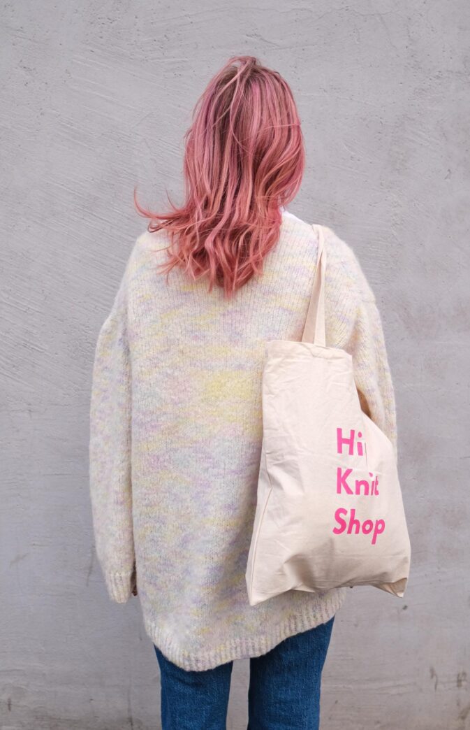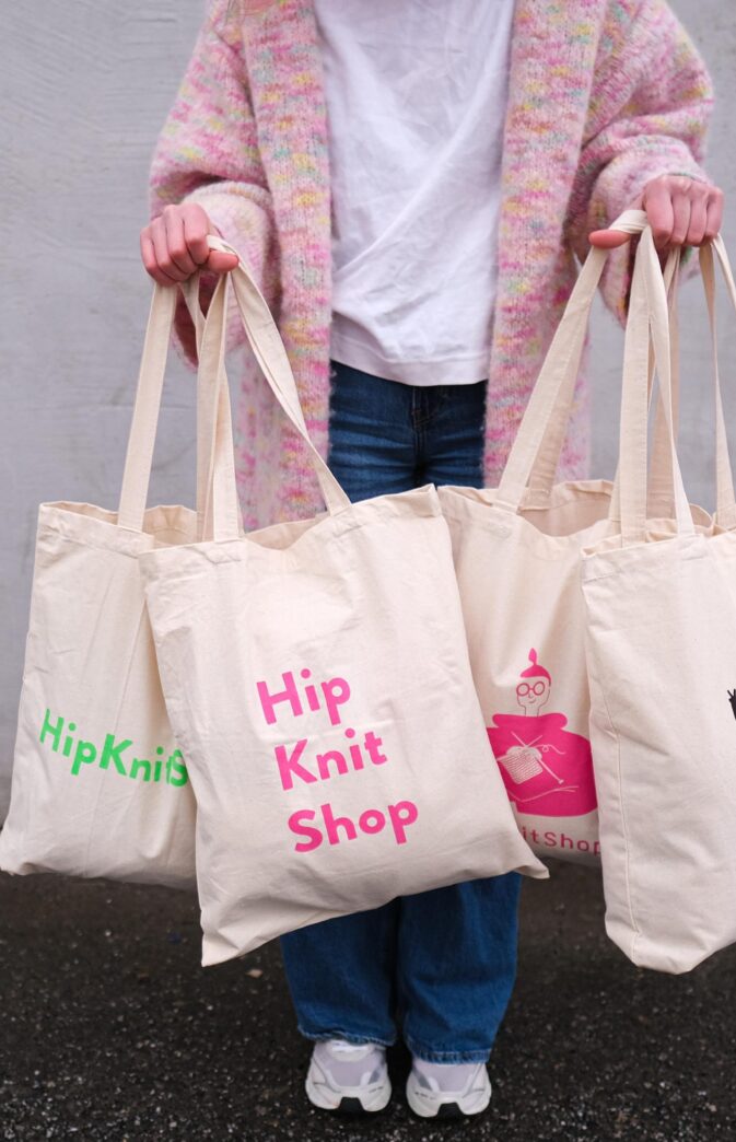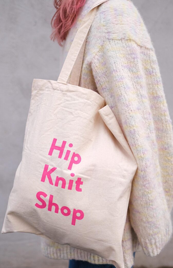 Handlenett med lange håndtak i kraftig bomullsstoff. Oppbevaring til strikkeprosjektet eller shoppingveske til handleturen.