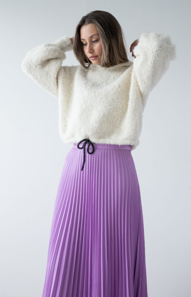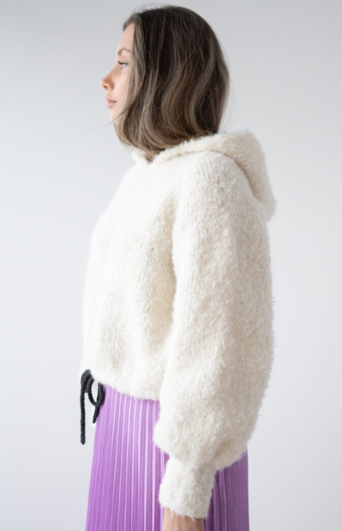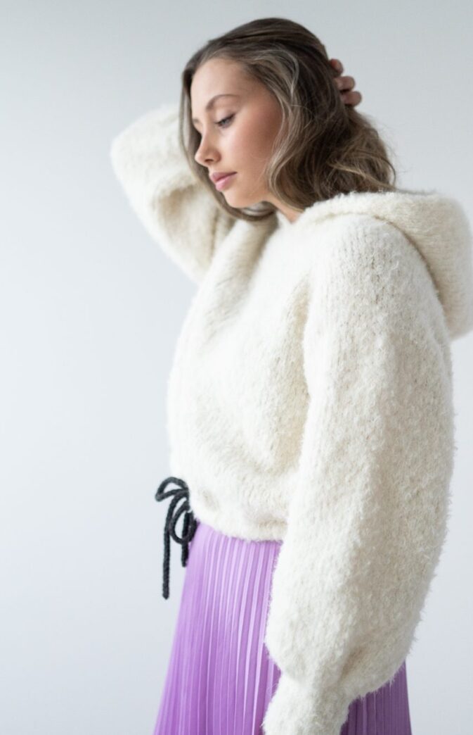 Strikkepakke med garn og gratis digital strikkeoppskrift. Strikket hettegenser dame. Deilig myk hettegenser strikket i Wild Wool. Strikkes ovenfra og ned, litt cropped og oversized – passer både til jeans og kjoler.