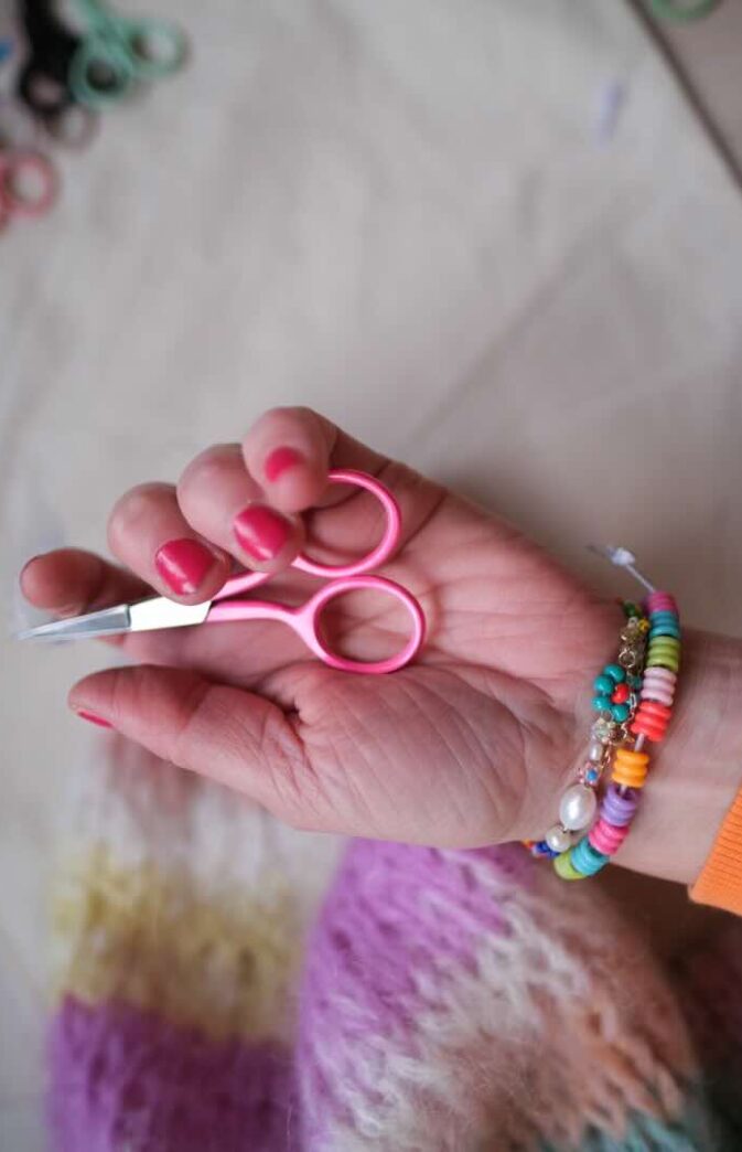 Knall rosa saks. Strikkesaks i rustfritt stål. Liten saks til strikk- og hobbybruk. Skarp saks som klipper lett og presist i alle tråder og stoffer. Behagelig grep og lett å ta med på farten. Saksen har også vært med oss på fly.