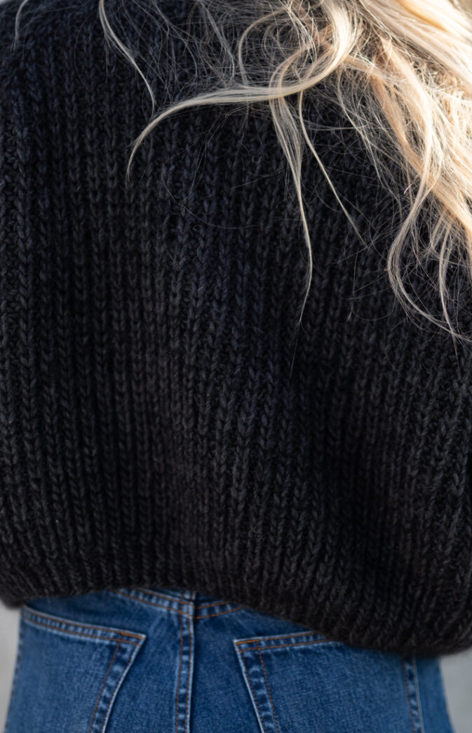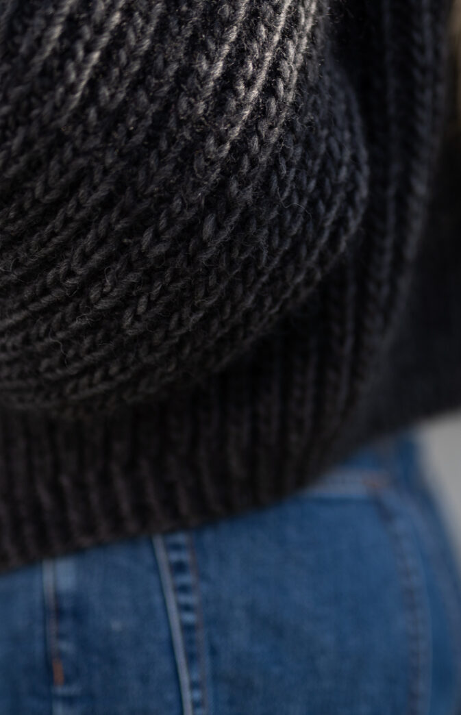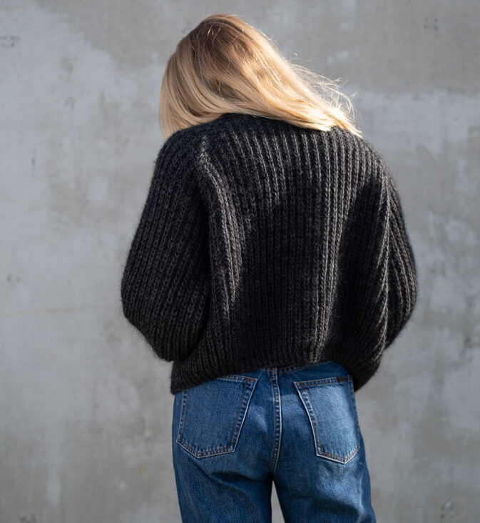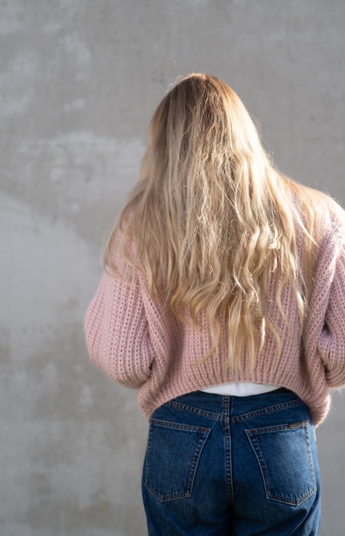 Avbildet i "Dusty Candyfloss" Hip Wool og "Candyfloss" Hip Mohair i str S-M og "Groovy Dark Grey" Hip Wool og "Black is Back" Hip Mohair I str L-XL på modell 168 høy