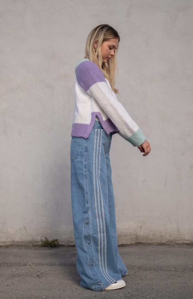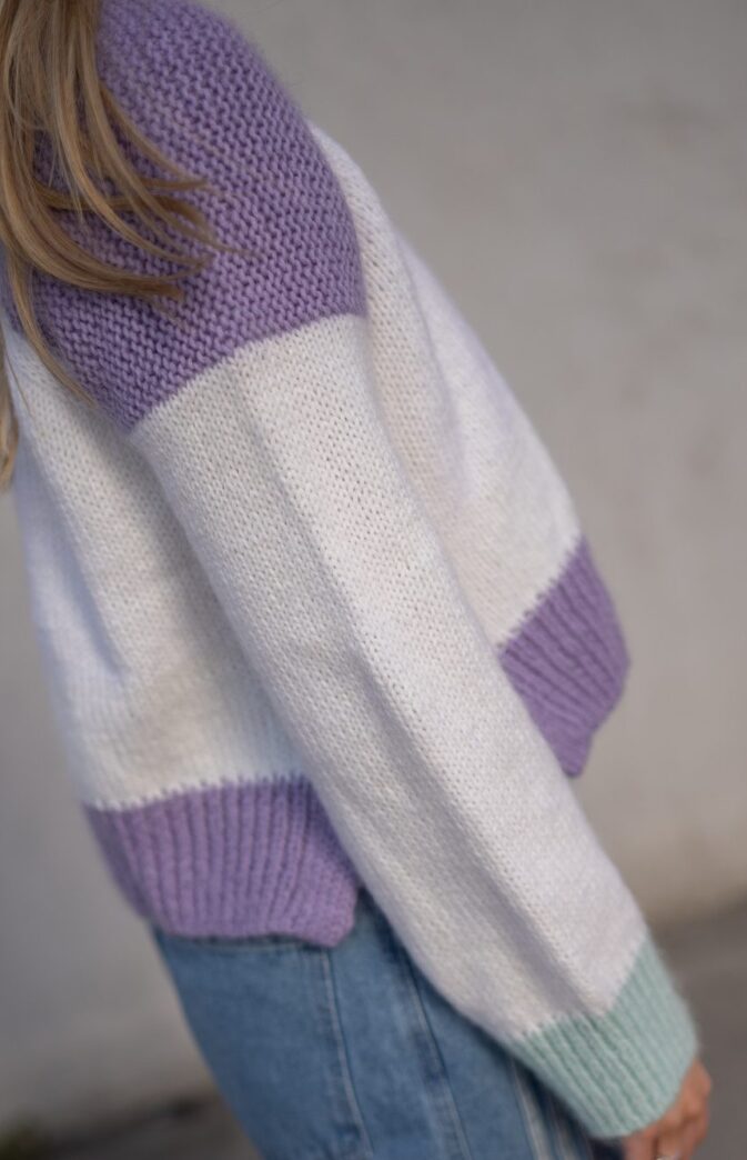 Avbildet i Pop Merino og Hip mohair hovedfarge: «Marshmallow» og «Cotton Ball White»; «Lavender Love» og «Perfect Purple» og «Hint of Mint» og «Must Have Mint» (str S på modell 160 cm)