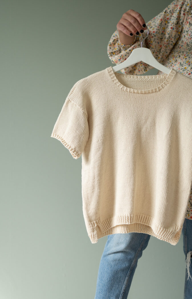 Sommerstrikk ! Jubel t-skjorta – strikket i det mykeste bomullsgarnet. Enkel og pen strikket t-skjorte, perfekt for sommerens festivaler og parkliv. Strikket nedenfra og opp i Cuddle Me Cotton, monteringsfri. Normal passform.
