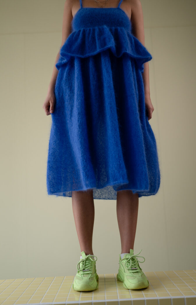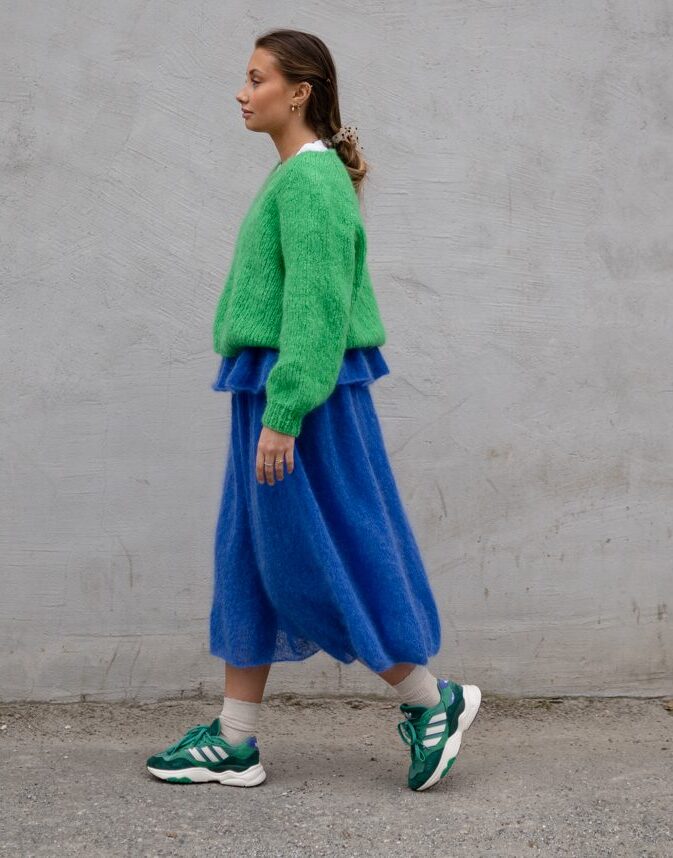 Avbildet i Hip Mohair "Bubbly Blue" 2 tråder på hele kjolen, "Candyfloss" Hip Mohair med 1 tråd på skjørtene og avbildet med grønn genser er kjolen i "Bubbly Blue" Hip Mohair 1 tråd på skjørtene.