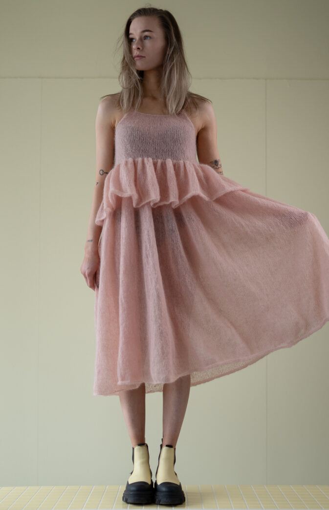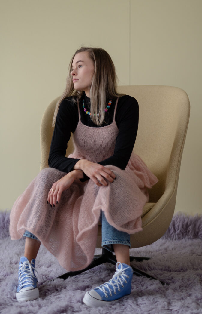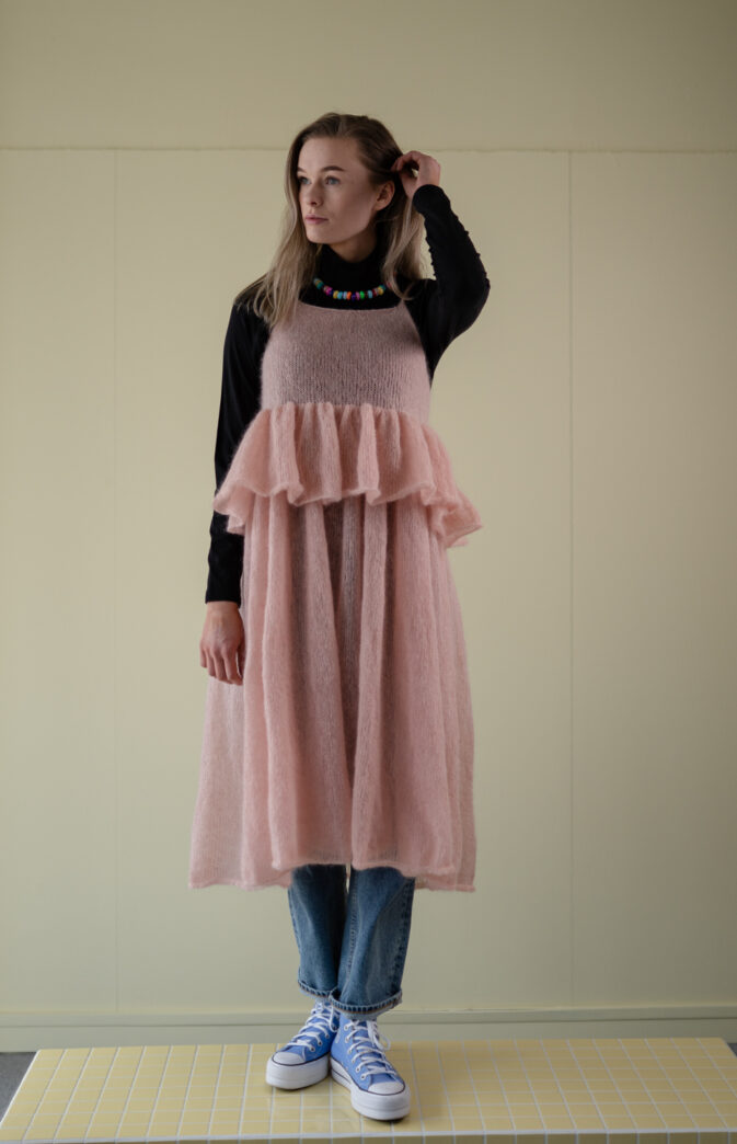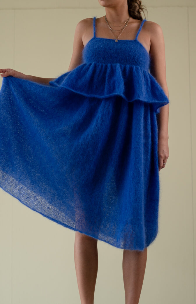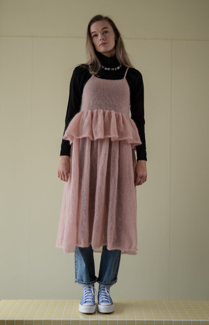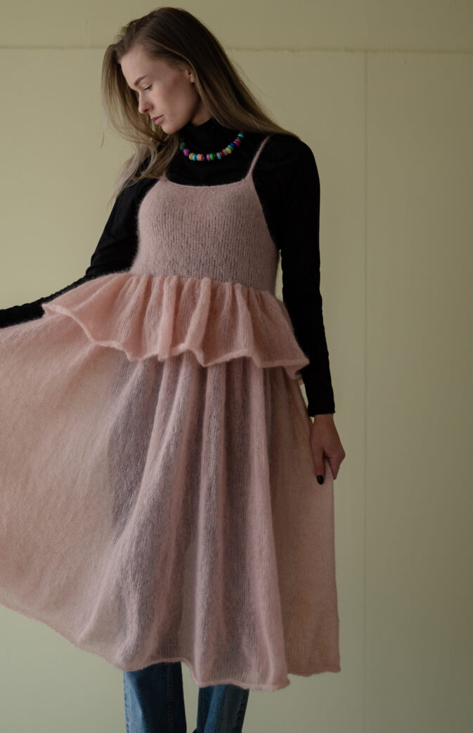 Strikkepakke med garn og gratis digital strikkeoppskrift. Nydelig tyllkjole dame. Milla er en skikkelig fin tyllkjole som kan brukes til hverdag eller fest, strikket i enkel og dobbel tråd Hip Mohair. Strikkes fra midten, toppen strikkes oppover og du avslutter med i-cord snorer. Kjolen har 2 skjørt, et kort «overskjørt» og et lengre skjørt under. Vi har laget kjolen i kort og lang modell.