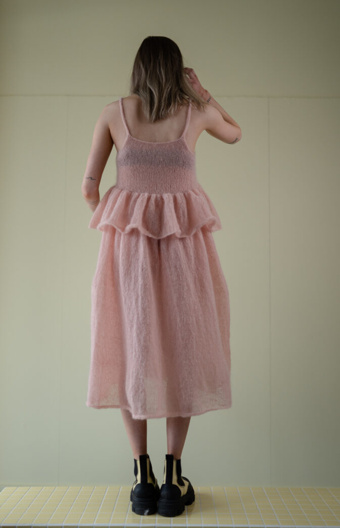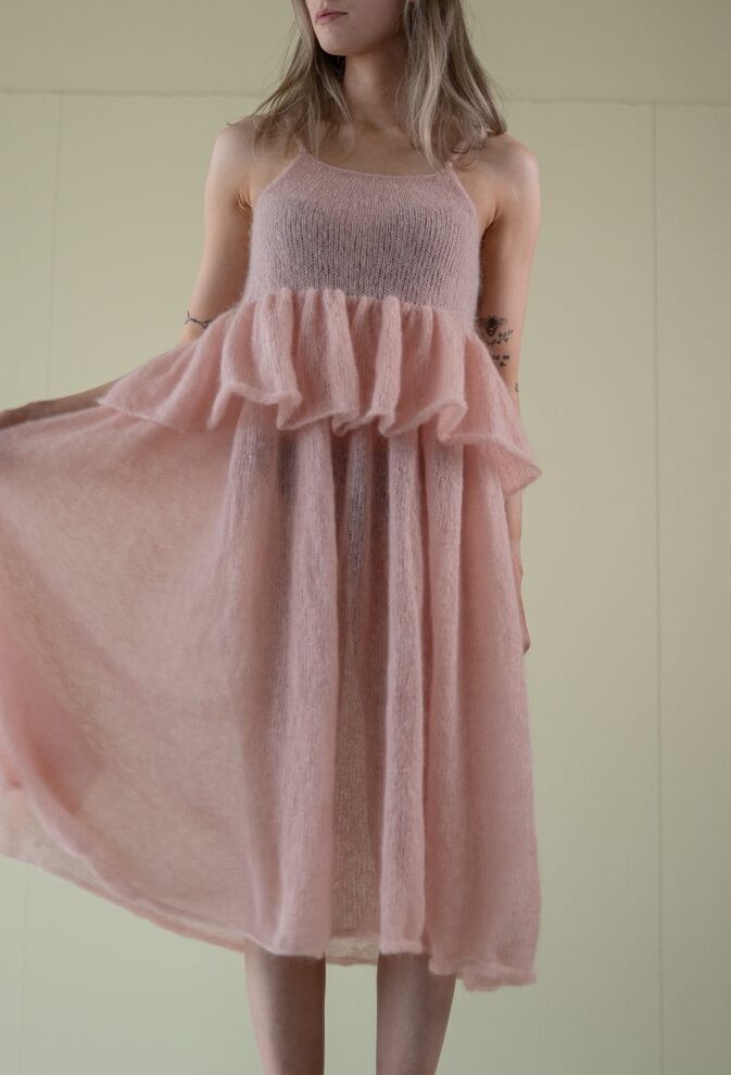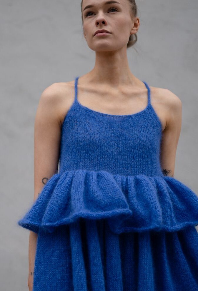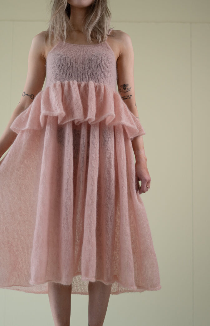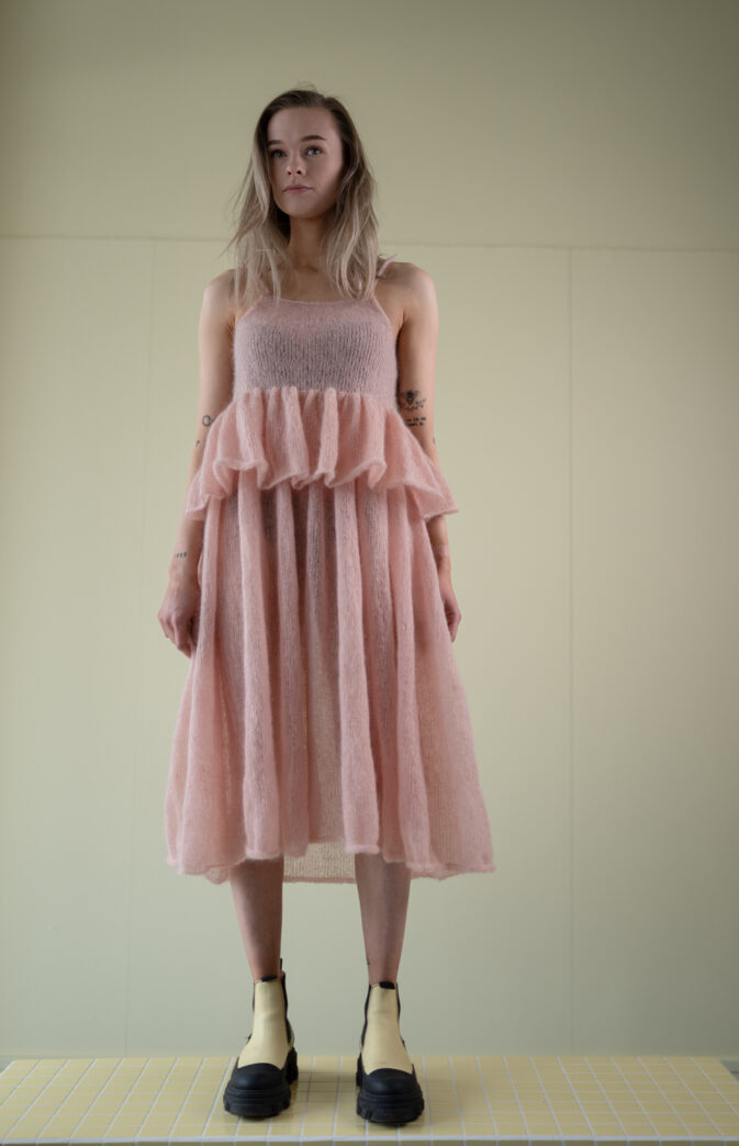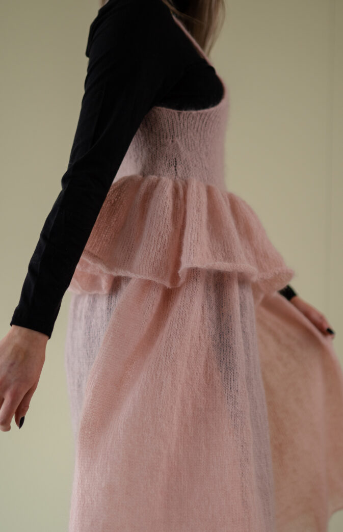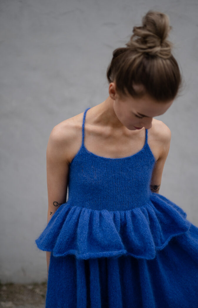 Strikkepakke med garn og gratis digital strikkeoppskrift. Nydelig tyllkjole dame. Milla er en skikkelig fin tyllkjole som kan brukes til hverdag eller fest, strikket i enkel og dobbel tråd Hip Mohair. Strikkes fra midten, toppen strikkes oppover og du avslutter med i-cord snorer. Kjolen har 2 skjørt, et kort «overskjørt» og et lengre skjørt under. Vi har laget kjolen i kort og lang modell.