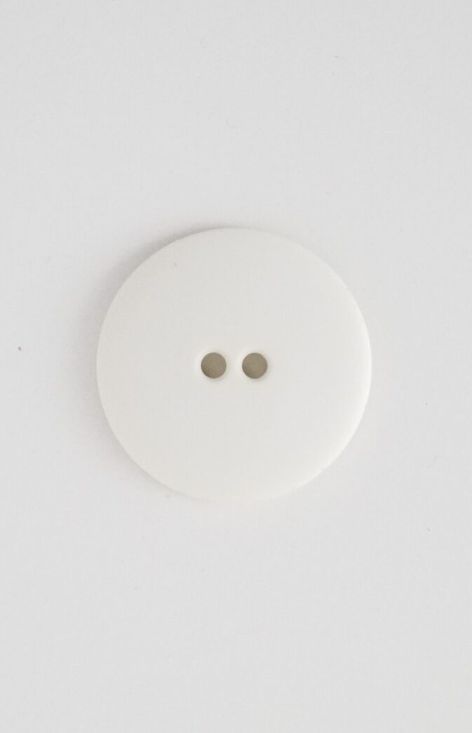 Hvit rund plastknapp med to hull. Matt / Uten- glans knapp.