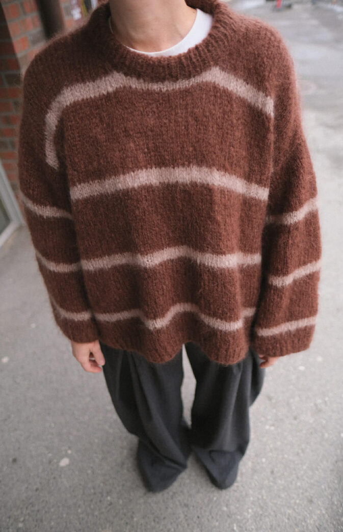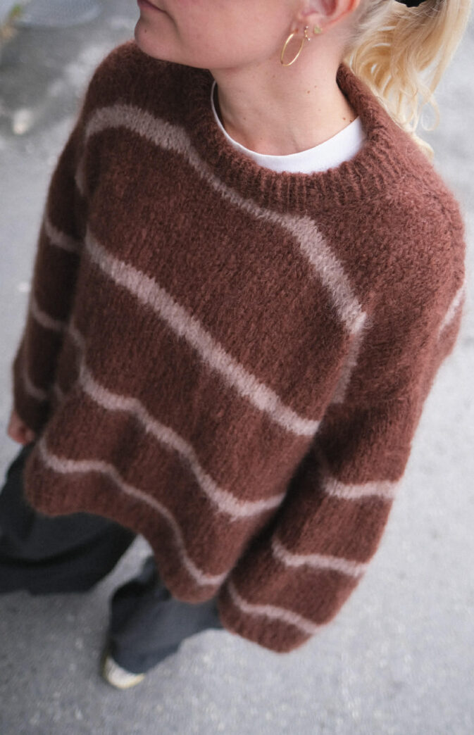 Avbildet i Fluff Mohair «Late night Party» striper «Pine Forest» str M. Brun genser «Chocolate Crush» striper i «Biscuit» str L (strikket litt kortere enn lengdemål i oppskrift)