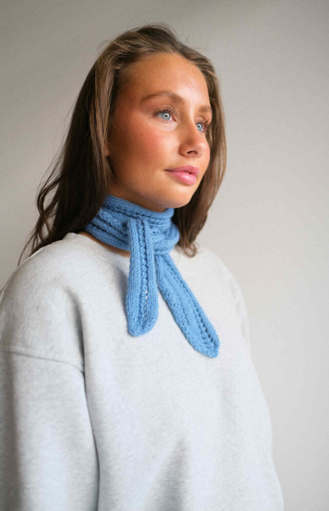 Strikkepakke med garn og gratis digital strikkeoppskrift på lite skjerf. Et lite søtt skjerf – perfekt tilbehør for sesongen. Strikkes frem og tilbake med et enkelt hullmønster.