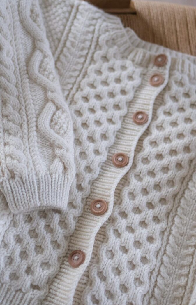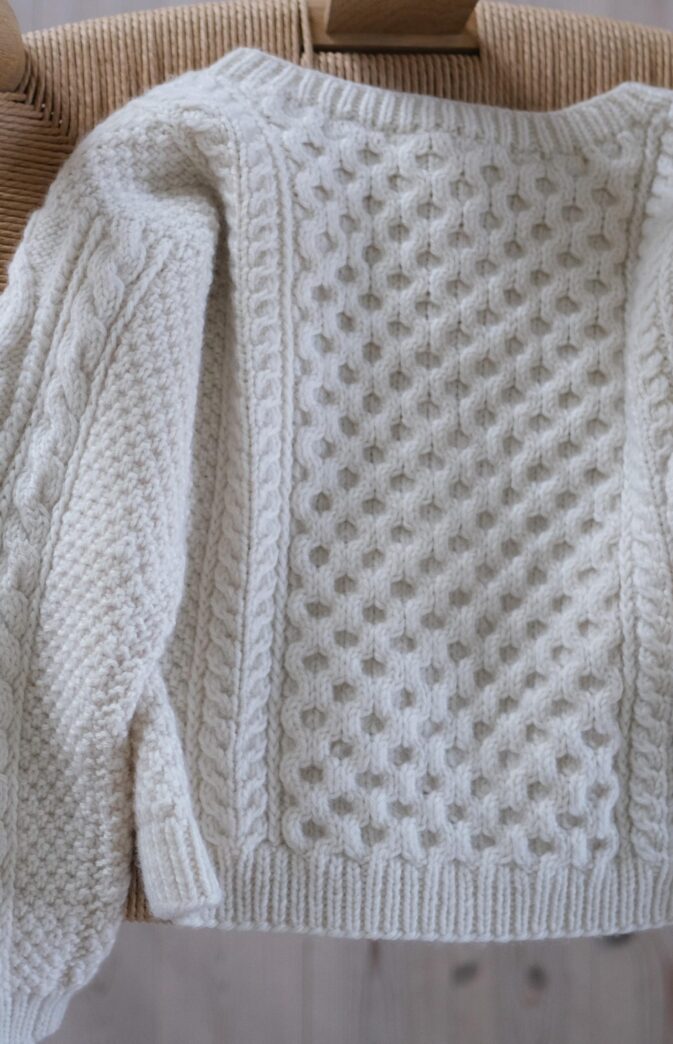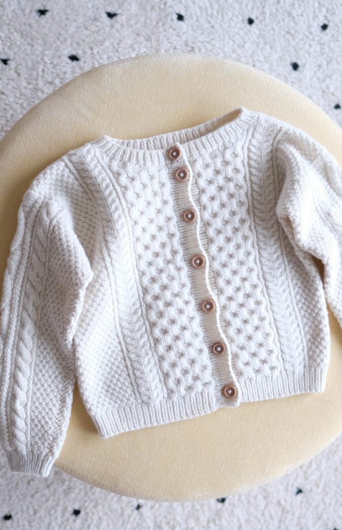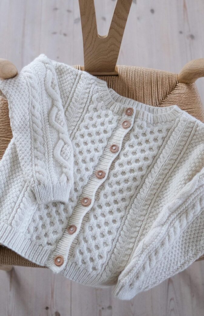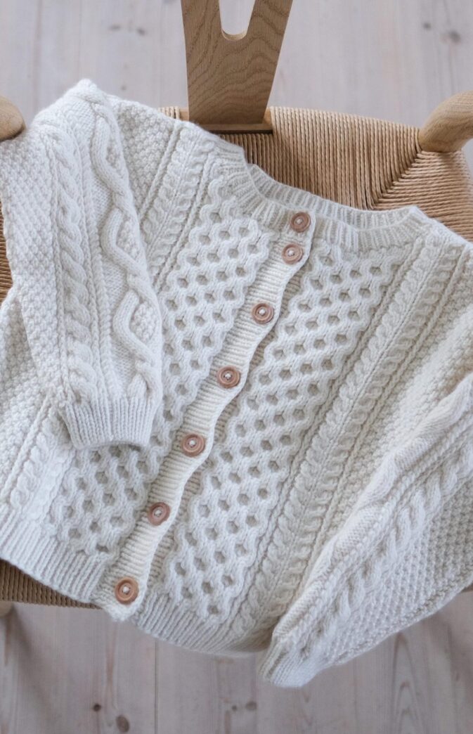 Strikkepakke med garn og gratis digital strikkeoppskrift. Nydelig og tidløs flettejakke til små og store barn strikket i myk merinoull. Bolen strikkes nedenfra og opp med fletter og perlestrikk. Det plukkes opp masker til ermer som strikkes ovenfra og ned. Til slutt plukkes det opp masker til knappestolper.