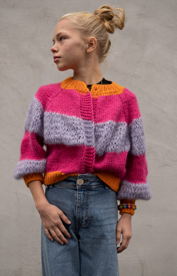 Avbildet i Hip Wool «On fire orange» (farge 1), «Flamingo Fever» Hip Wool (farge 2) og Fluff Mohair «Lilac breeze» str 10 år på jente 11 år