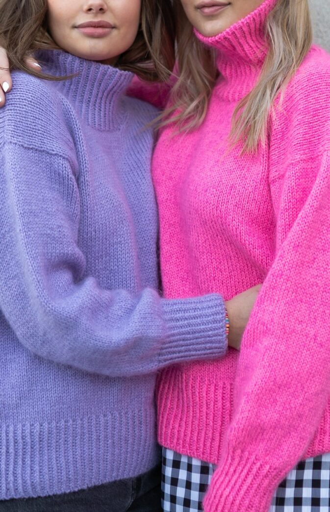 Avbildet i farge "Pink Crush" Pop Merino holdt sammen med "Bubblegum" Hip Mohair", "Bonbon Minty Blue" Pop Merino holdt sammen med "Minty Breeze" Hip Mohair og "Lavender" Pop Merino holdt sammen med "Perfect Purple" Hip Mohair