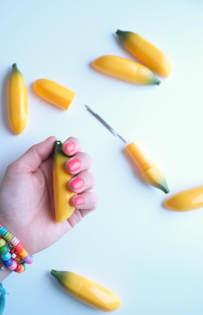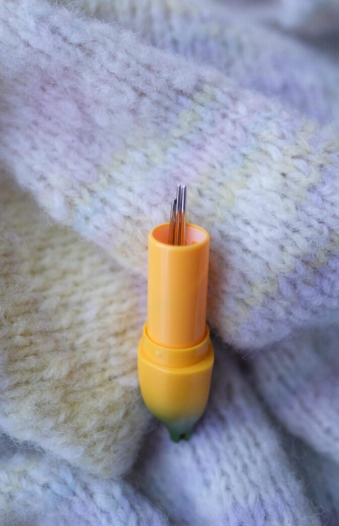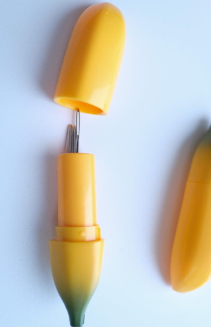 Gøy oppbevaring til synåler. Nåle-etui formet som en banan. Nålene skrus opp ved å vri på ene delen. Passer til nåler opp til rett under 6 cm. For større nåler passer vår Chili nåleholder. Perfekt til å ha i strikkenettet sammen med strikketøy og annet tilbehør strikk!