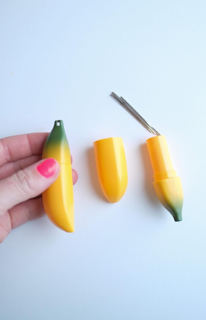 Gøy oppbevaring til synåler. Nåle-etui formet som en banan. Nålene skrus opp ved å vri på ene delen. Passer til nåler opp til rett under 6 cm. For større nåler passer vår Chili nåleholder. Perfekt til å ha i strikkenettet sammen med strikketøy og annet tilbehør strikk!