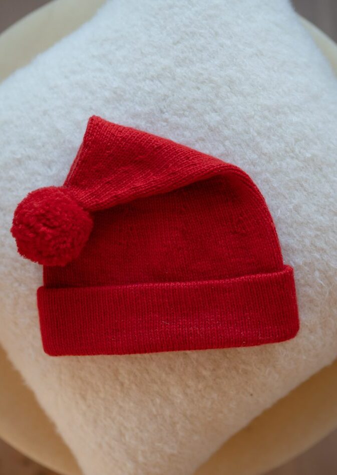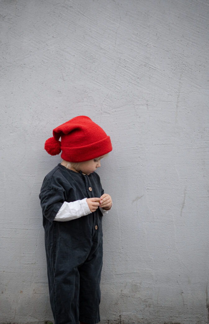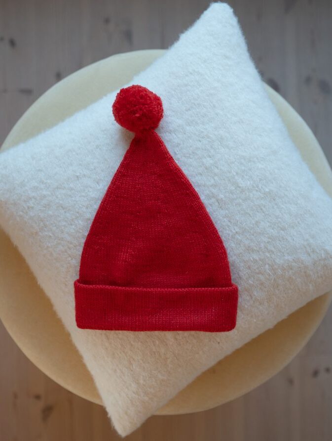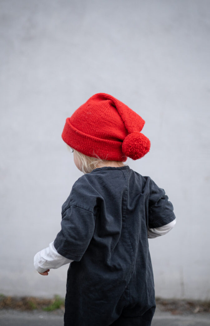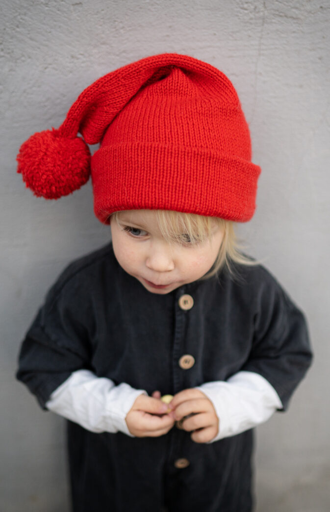 Strikkepakke med garn og gratis digital strikkeoppskrift. Strikkeoppskrift til nisselue baby og barn. Lang nisselue med dusk i Pop Merino. Nisseluen har en dobbelbrettet kant for ekstra varme rundt ørene.