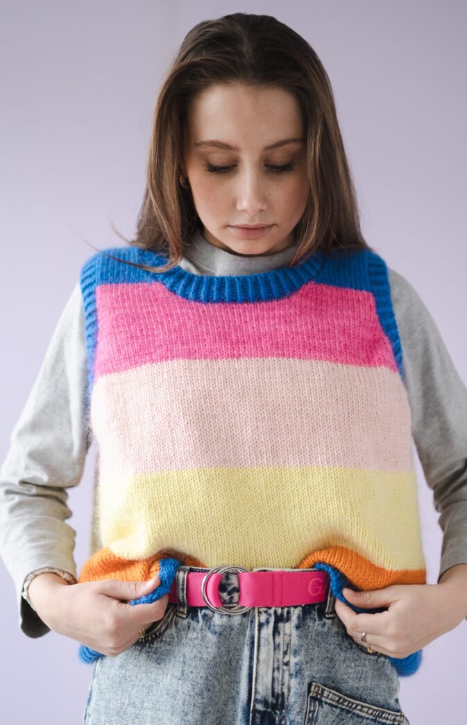 Strikkepakke med garn og gratis digital strikkeoppskrift. Strikkeoppskrift vest / slipover dame med striper. Lett oversized slipover som strikkes ovenfra og ned i en tråd Pop merino og en tråd Hip Mohair. Først strikkes for- og bakstykket hver for seg, frem og tilbake. Når ermeåpningen er ferdig settes stykkene sammen på pinne og strikkes videre nedover bol rundt i omgang.