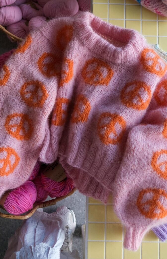 Strikkepakke med garn og gratis digital strikkeoppskrift. Give Peace a chance sweater – Nydelig genser med klart budskap. Gøy, fin og fluffy! Denne er tilnærmet helt lik vår Fruity sweater, men annet diagram og dermed justeringer i maskeantall.
